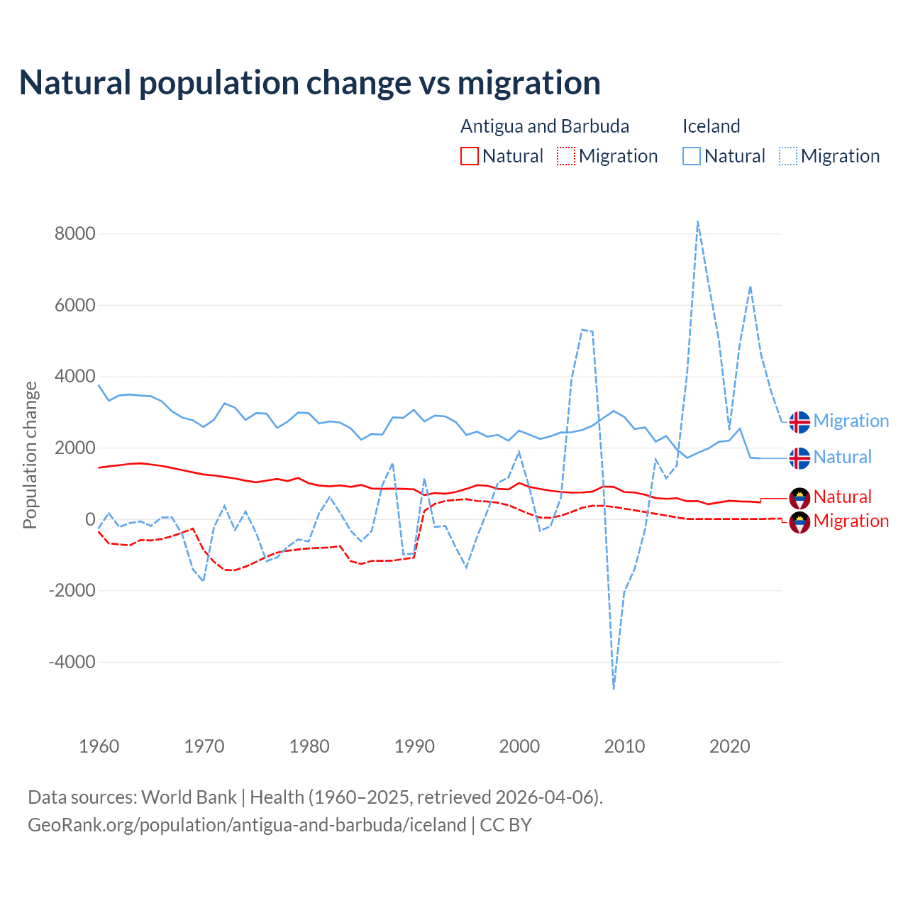 Over the last 10 years, 97.2% of the population change in Antigua and Barbuda is from natural causes (a gain of 4,971 people) and 2.76% is from migration (a gain of 141 people). In Iceland 30.7% is from natural causes (a gain of 20,128 people) and 69.3% is from migration (a gain of 45,356 people).