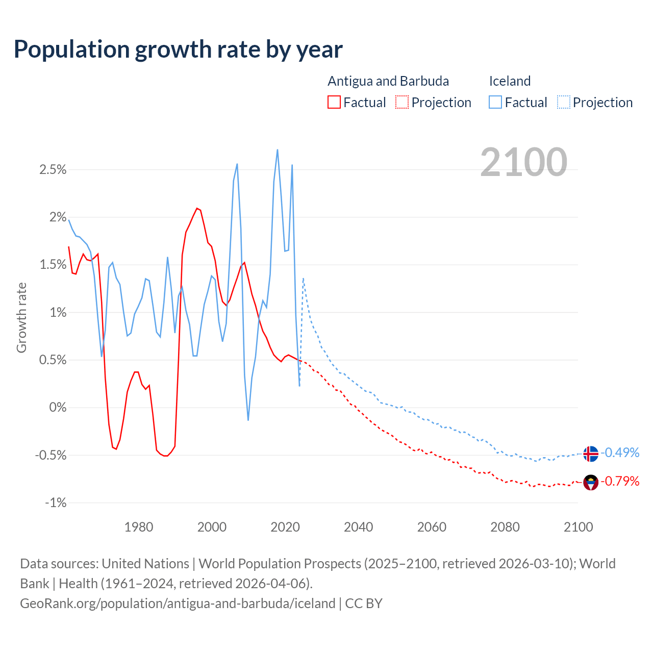 - For the last 10 years, Antigua and Barbuda has had an average growth rate of +0.57% per year vs +1.63% in Iceland.