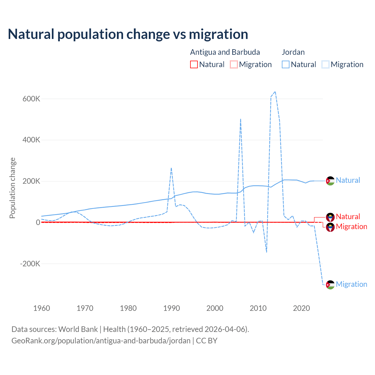 Over the last 10 years, 97.2% of the population change in Antigua and Barbuda is from natural causes (a gain of 4,971 people) and 2.76% is from migration (a gain of 141 people). In Jordan 63.2% is from natural causes (a gain of 1,991,452 people) and 36.8% is from migration (a gain of 1,157,625 people).