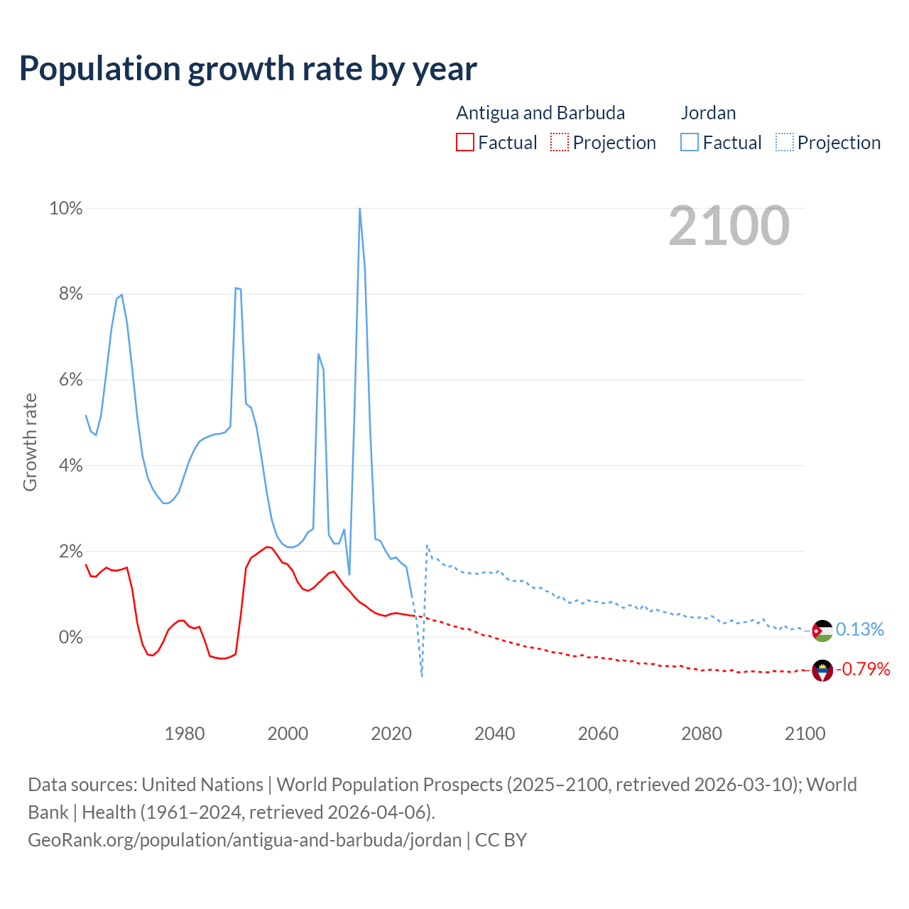 - For the last 10 years, Antigua and Barbuda has had an average growth rate of +0.57% per year vs +3.45% in Jordan.