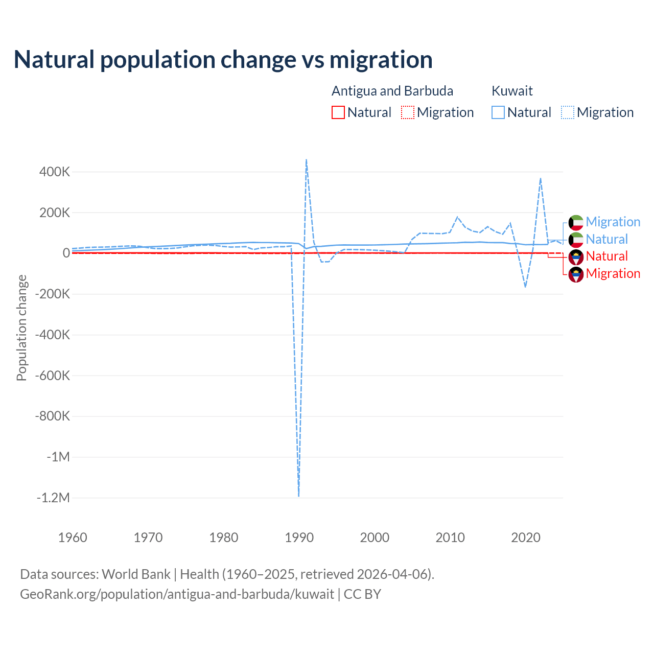 Over the last 10 years, 97.2% of the population change in Antigua and Barbuda is from natural causes (a gain of 4,971 people) and 2.76% is from migration (a gain of 141 people). In Kuwait 35.8% is from natural causes (a gain of 470,645 people) and 64.2% is from migration (a gain of 845,142 people).