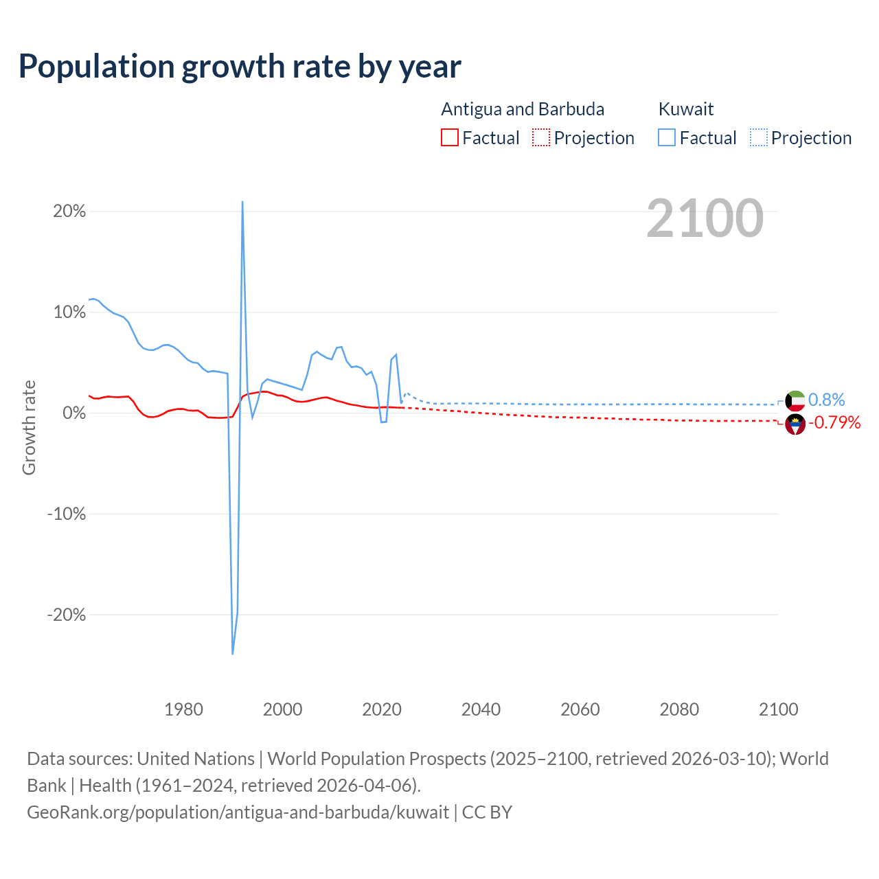- For the last 10 years, Antigua and Barbuda has had an average growth rate of +0.57% per year vs +3.1% in Kuwait.