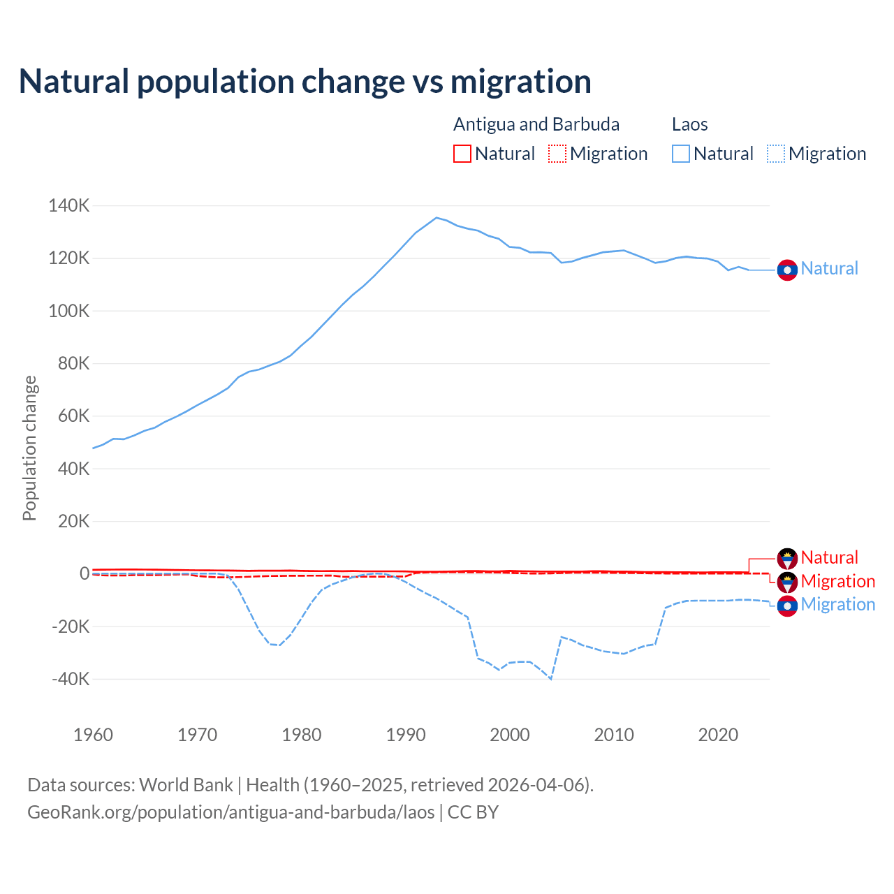 Over the last 10 years, 97.2% of the population change in Antigua and Barbuda is from natural causes (a gain of 4,971 people) and 2.76% is from migration (a gain of 141 people). In Laos 90.6% is from natural causes (a gain of 1,183,013 people) and 9.41% is from migration (a loss of 122,899 people).