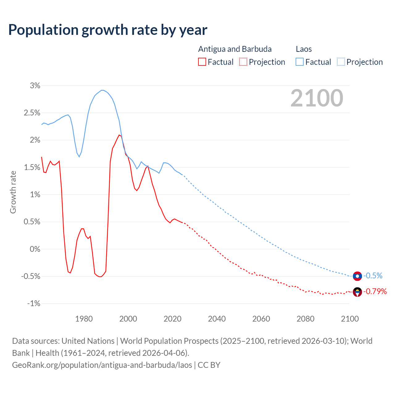 - For the last 10 years, Antigua and Barbuda has had an average growth rate of +0.57% per year vs +1.48% in Laos.