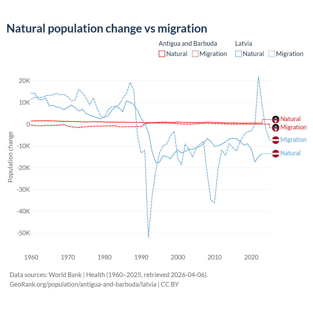Over the last 10 years, 97.2% of the population change in Antigua and Barbuda is from natural causes (a gain of 4,971 people) and 2.76% is from migration (a gain of 141 people). In Latvia 82.7% is from natural causes (a loss of 103,711 people) and 17.3% is from migration (a loss of 21,641 people).