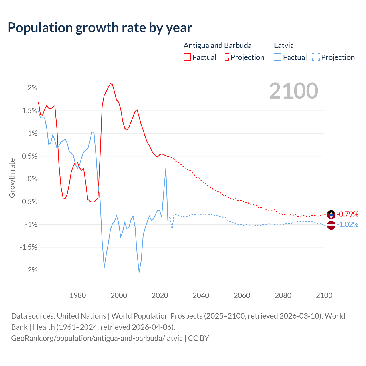 Antigua and Barbuda vs Latvia: population by year and forecast