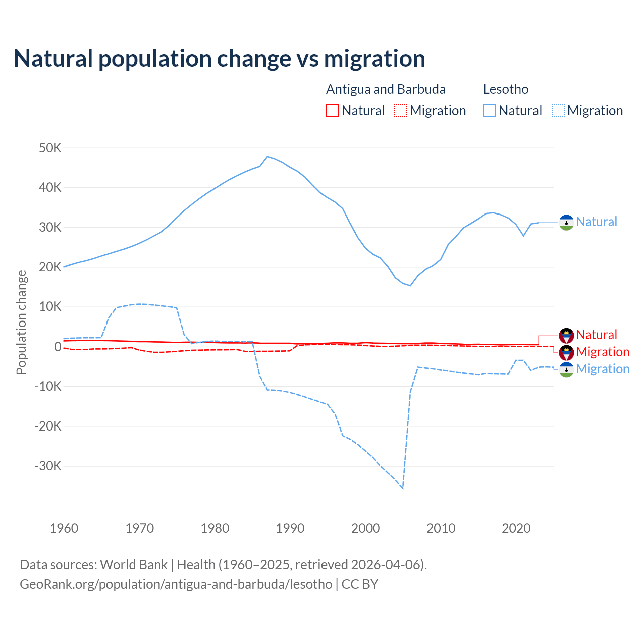 Over the last 10 years, 97.2% of the population change in Antigua and Barbuda is from natural causes (a gain of 4,971 people) and 2.76% is from migration (a gain of 141 people). In Lesotho 84.2% is from natural causes (a gain of 315,836 people) and 15.8% is from migration (a loss of 59,457 people).