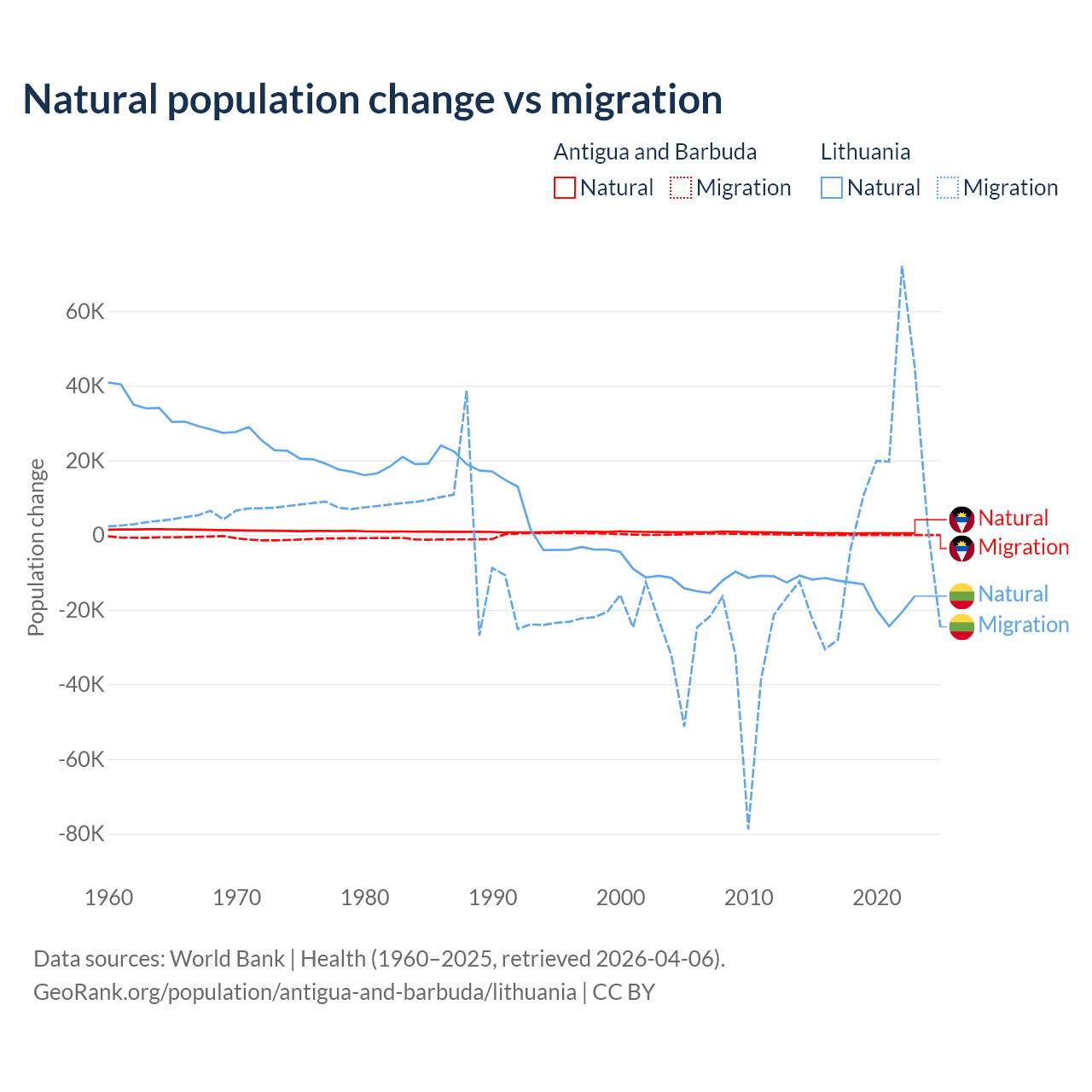 Over the last 10 years, 97.2% of the population change in Antigua and Barbuda is from natural causes (a gain of 4,971 people) and 2.76% is from migration (a gain of 141 people). In Lithuania 68.7% is from natural causes (a loss of 153,859 people) and 31.3% is from migration (a gain of 70,196 people).