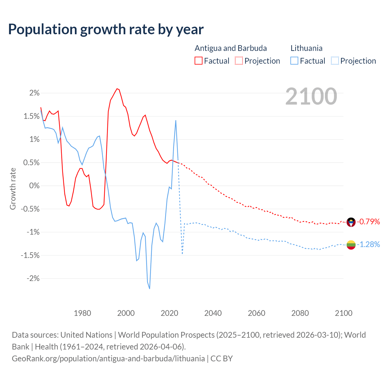 - For the last 10 years, Antigua and Barbuda has had an average growth rate of +0.57% per year vs -0.22% in Lithuania.