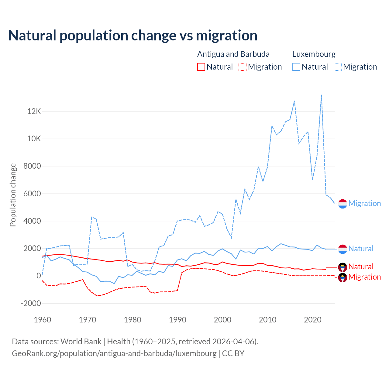 Over the last 10 years, 97.2% of the population change in Antigua and Barbuda is from natural causes (a gain of 4,971 people) and 2.76% is from migration (a gain of 141 people). In Luxembourg 16.8% is from natural causes (a gain of 20,287 people) and 83.2% is from migration (a gain of 100,435 people).