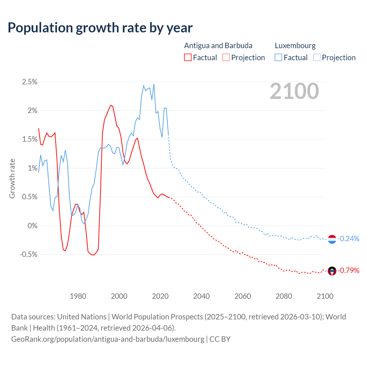 - For the last 10 years, Antigua and Barbuda has had an average growth rate of +0.57% per year vs +2.02% in Luxembourg.