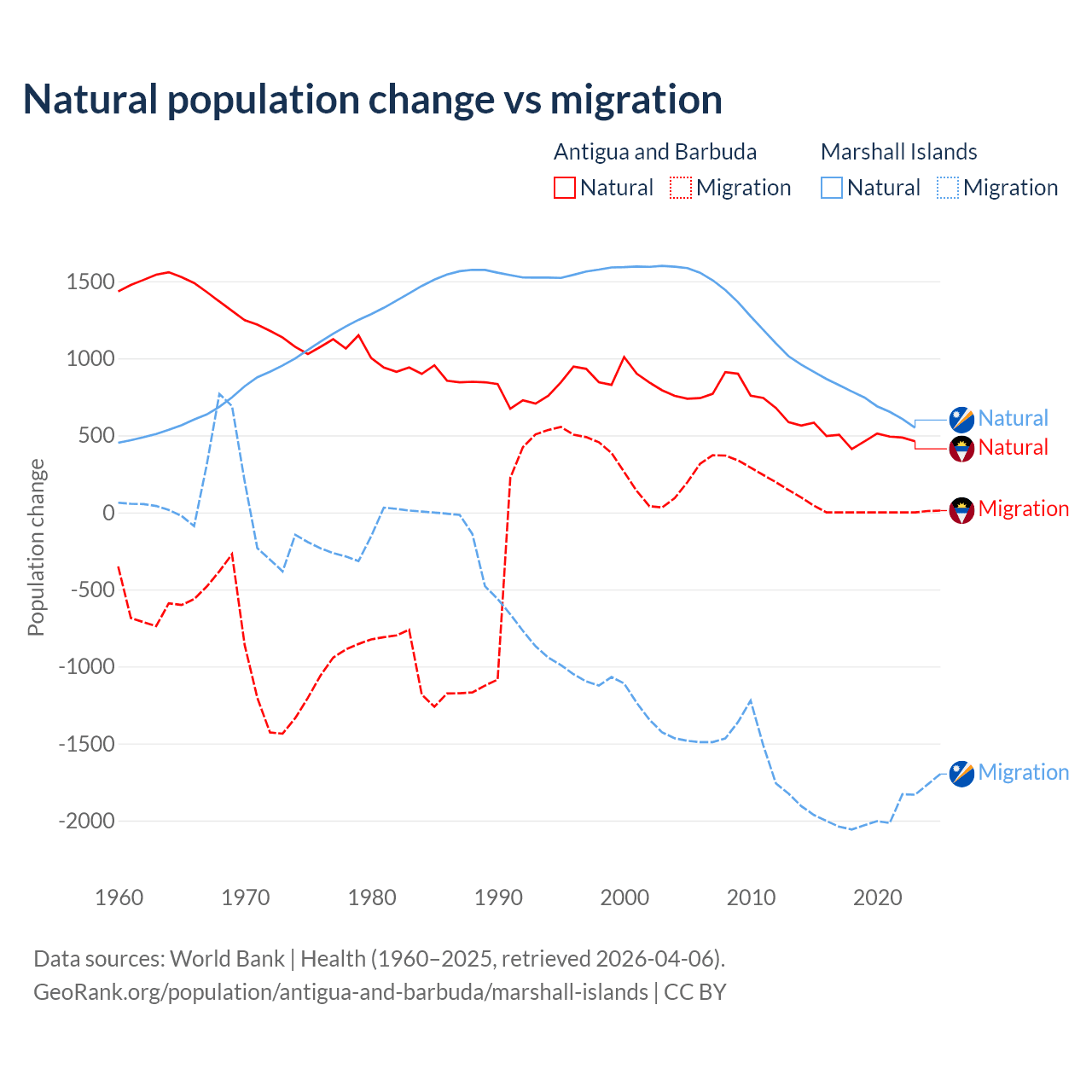 Over the last 10 years, 97.2% of the population change in Antigua and Barbuda is from natural causes (a gain of 4,971 people) and 2.76% is from migration (a gain of 141 people). In the Marshall Islands 27.8% is from natural causes (a gain of 7,592 people) and 72.2% is from migration (a loss of 19,682 people).