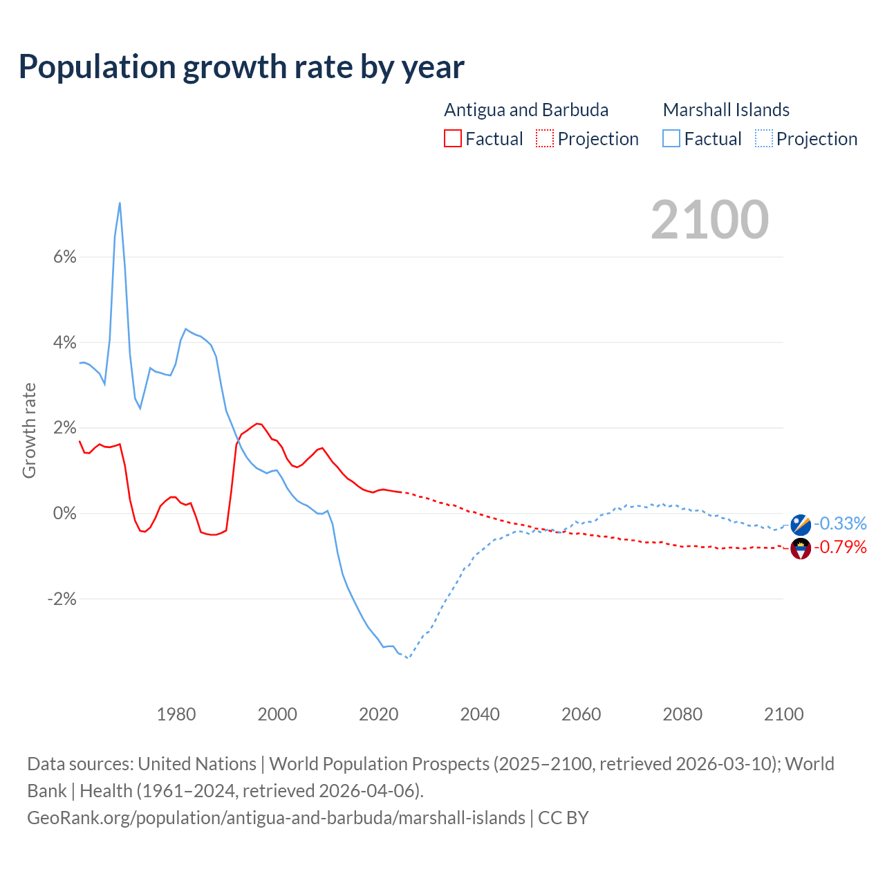 - For the last 10 years, Antigua and Barbuda has had an average growth rate of +0.57% per year vs -2.69% in the Marshall Islands.