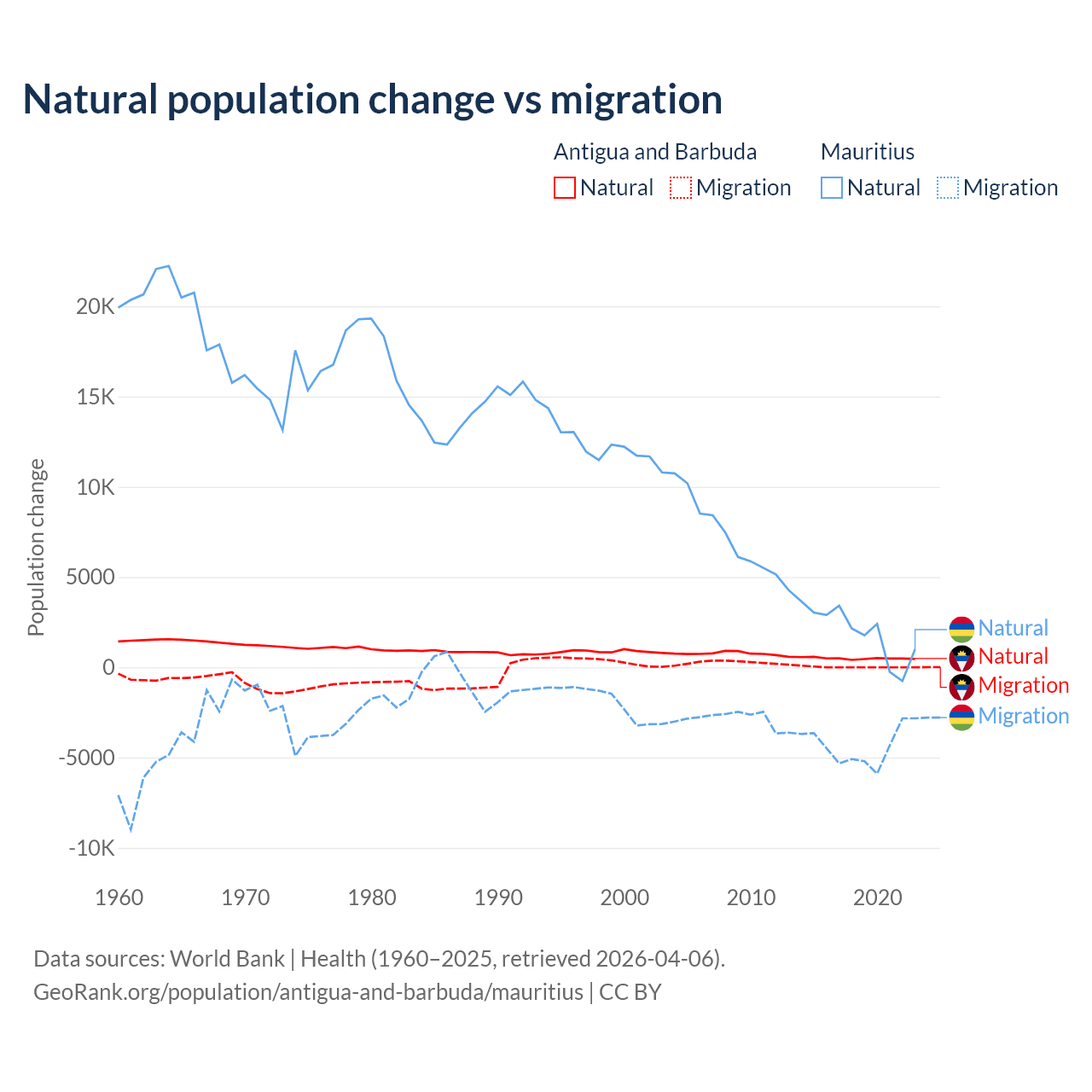 Over the last 10 years, 97.2% of the population change in Antigua and Barbuda is from natural causes (a gain of 4,971 people) and 2.76% is from migration (a gain of 141 people). In Mauritius 30.9% is from natural causes (a gain of 19,327 people) and 69.1% is from migration (a loss of 43,294 people).