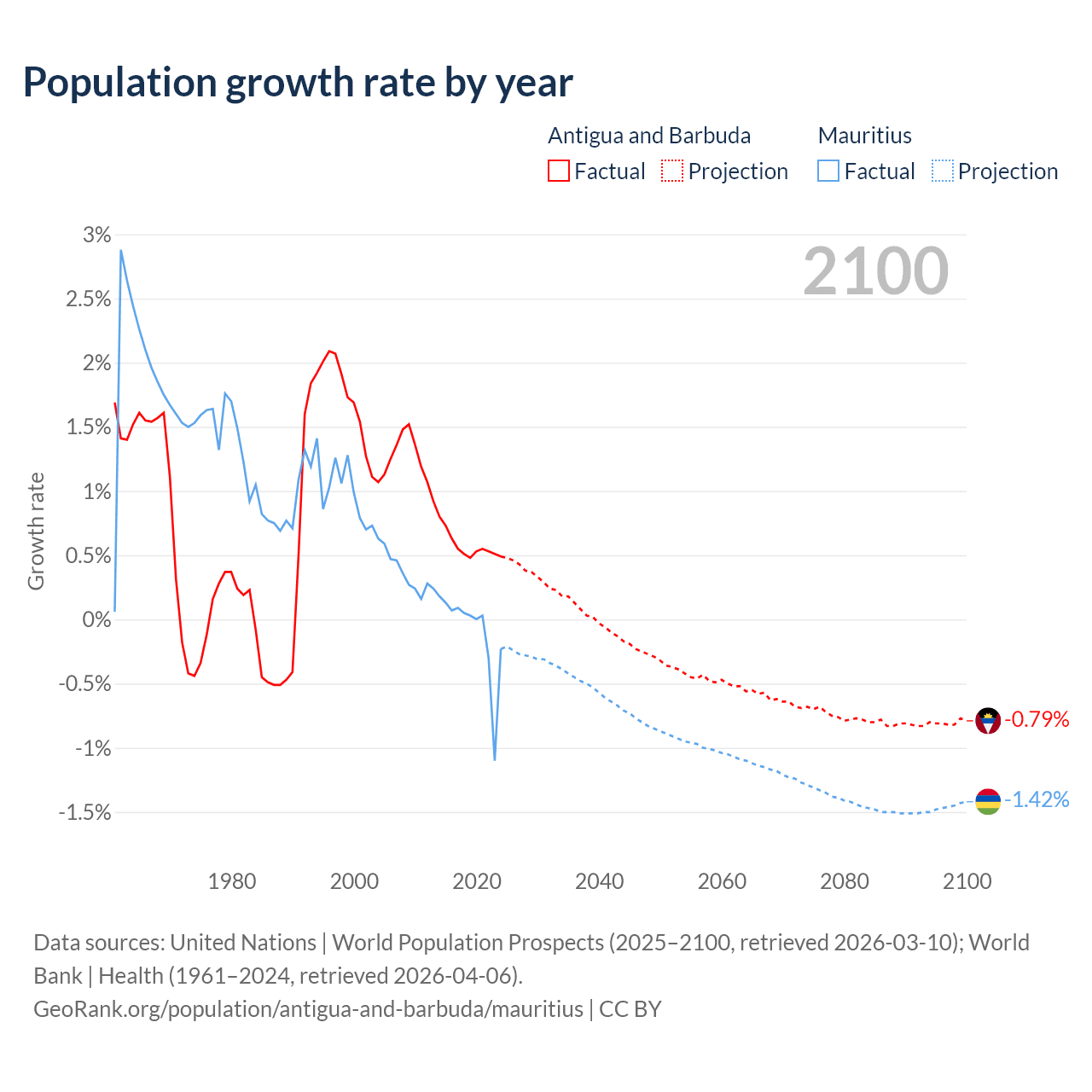 Antigua and Barbuda vs Mauritius: population by year and forecast