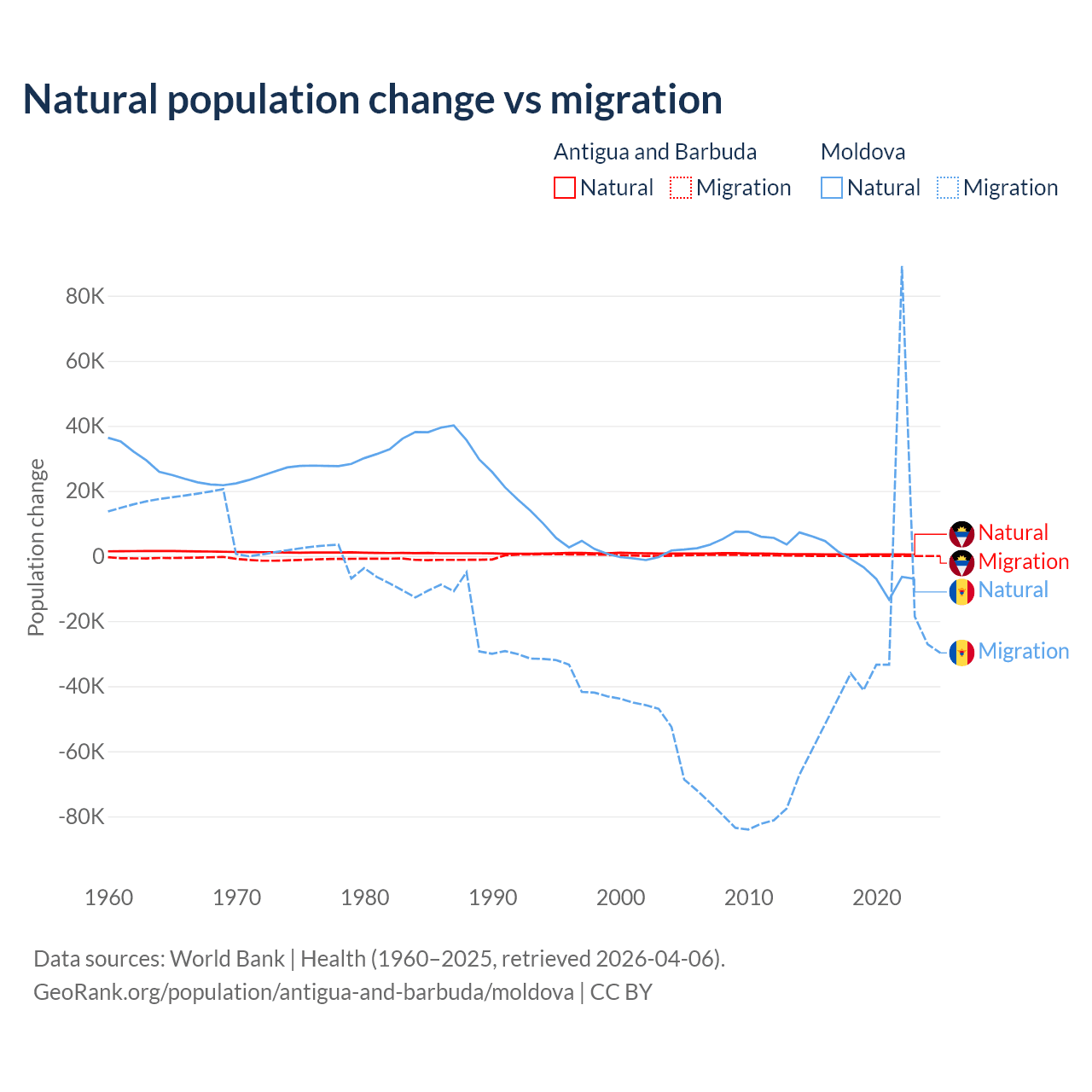Over the last 10 years, 97.2% of the population change in Antigua and Barbuda is from natural causes (a gain of 4,971 people) and 2.76% is from migration (a gain of 141 people). In Moldova 6.04% is from natural causes (a loss of 19,001 people) and 94% is from migration (a loss of 295,631 people).