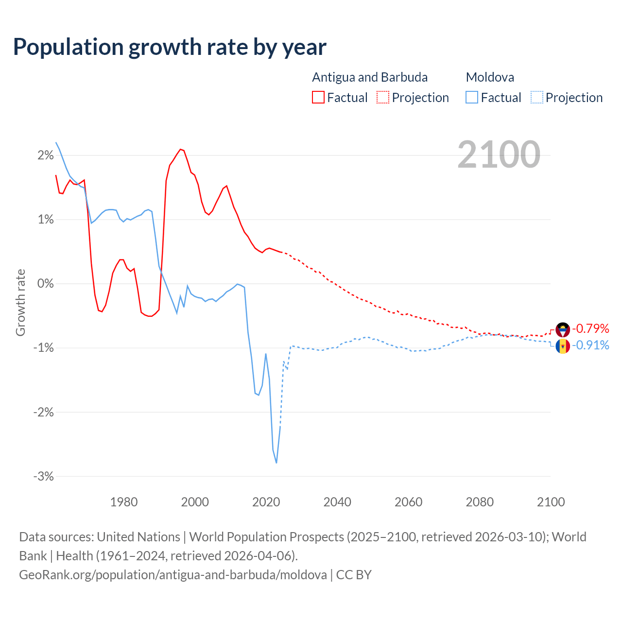 - For the last 10 years, Antigua and Barbuda has had an average growth rate of +0.57% per year vs -1.57% in Moldova.