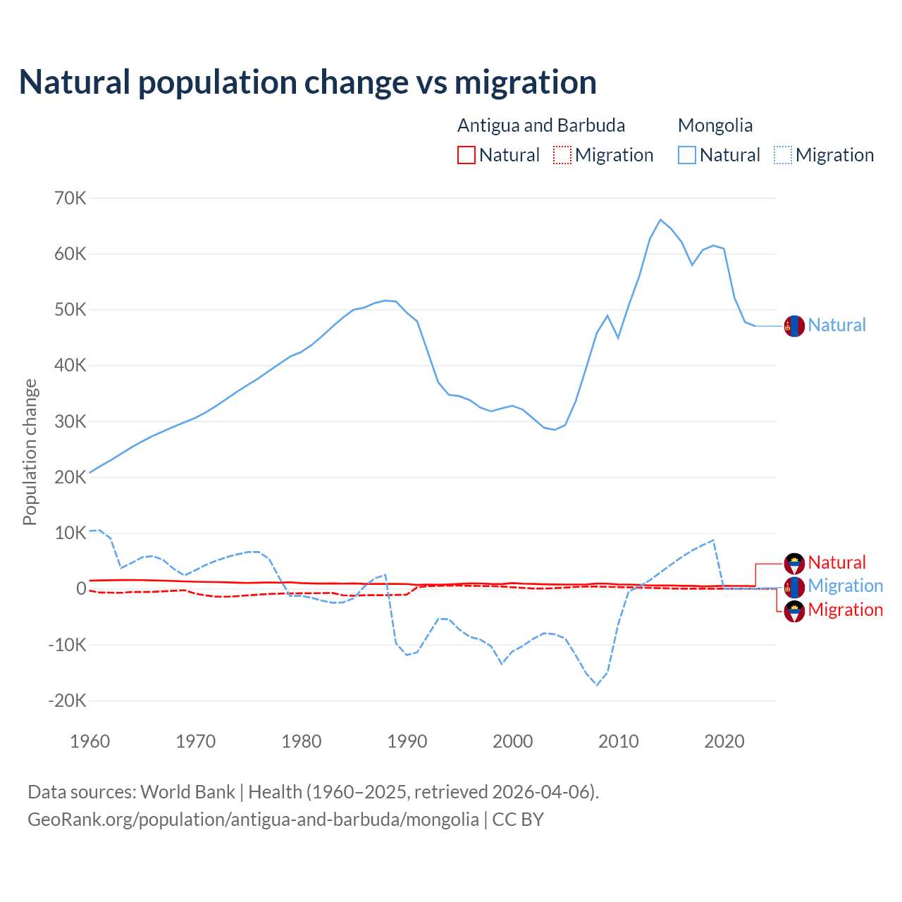 Over the last 10 years, 97.2% of the population change in Antigua and Barbuda is from natural causes (a gain of 4,971 people) and 2.76% is from migration (a gain of 141 people). In Mongolia 94.1% is from natural causes (a gain of 580,367 people) and 5.87% is from migration (a gain of 36,163 people).