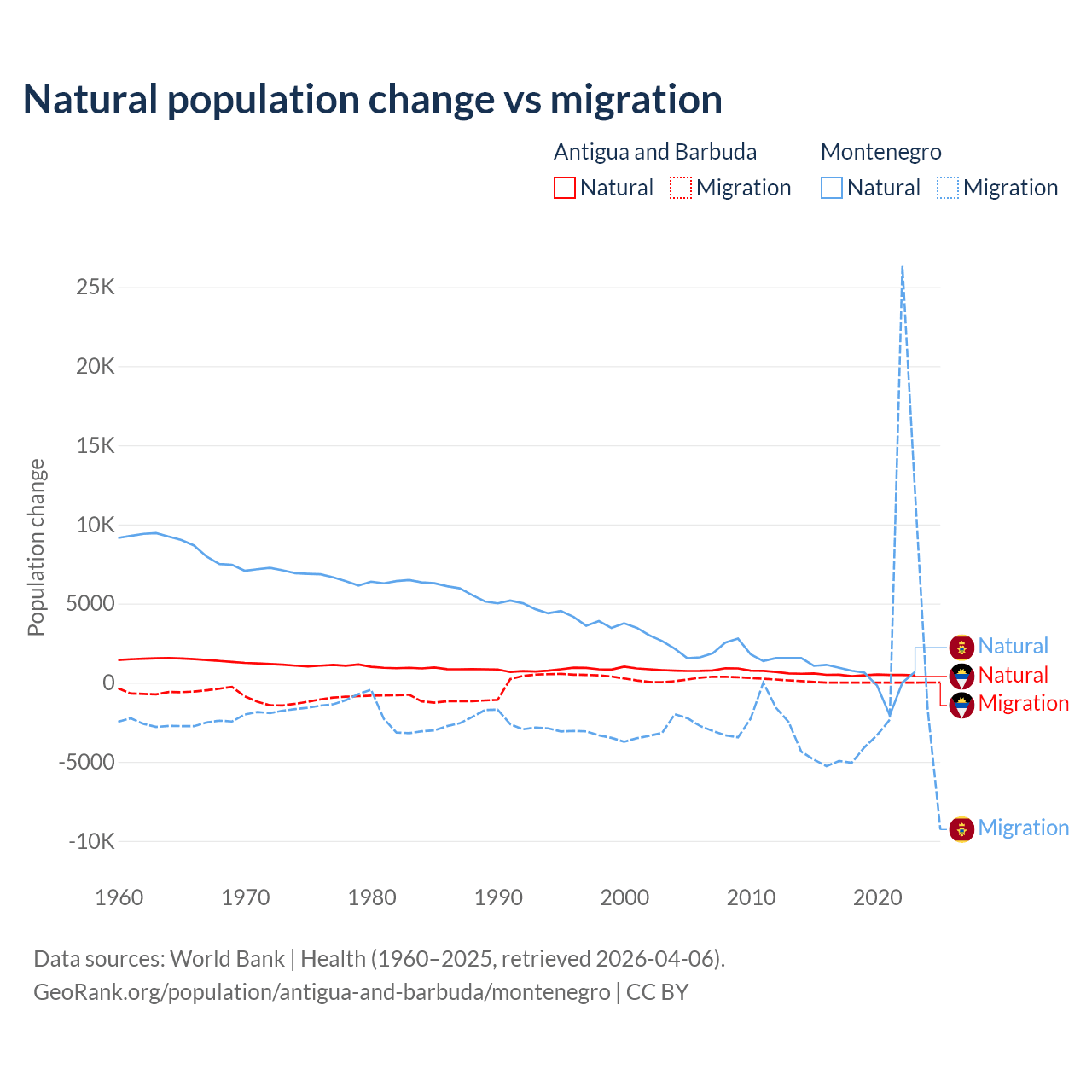 Over the last 10 years, 97.2% of the population change in Antigua and Barbuda is from natural causes (a gain of 4,971 people) and 2.76% is from migration (a gain of 141 people). In Montenegro 52.4% is from natural causes (a gain of 4,501 people) and 47.6% is from migration (a gain of 4,095 people).