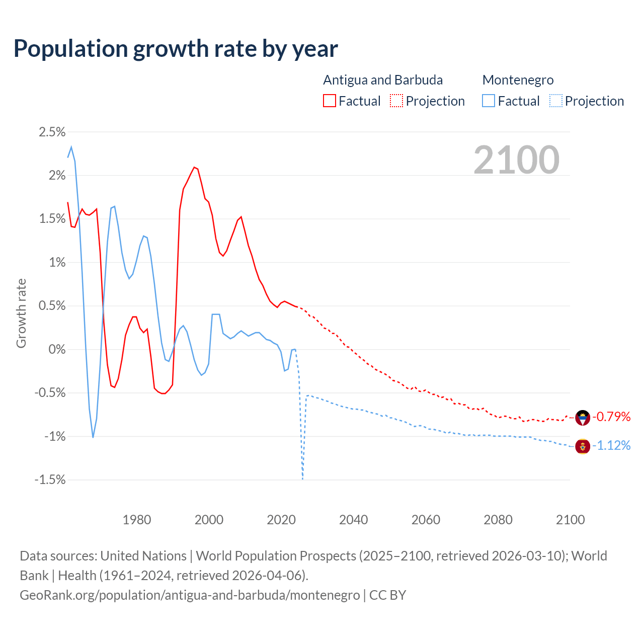 - For the last 10 years, Antigua and Barbuda has had an average growth rate of +0.57% per year vs +0.01% in Montenegro.