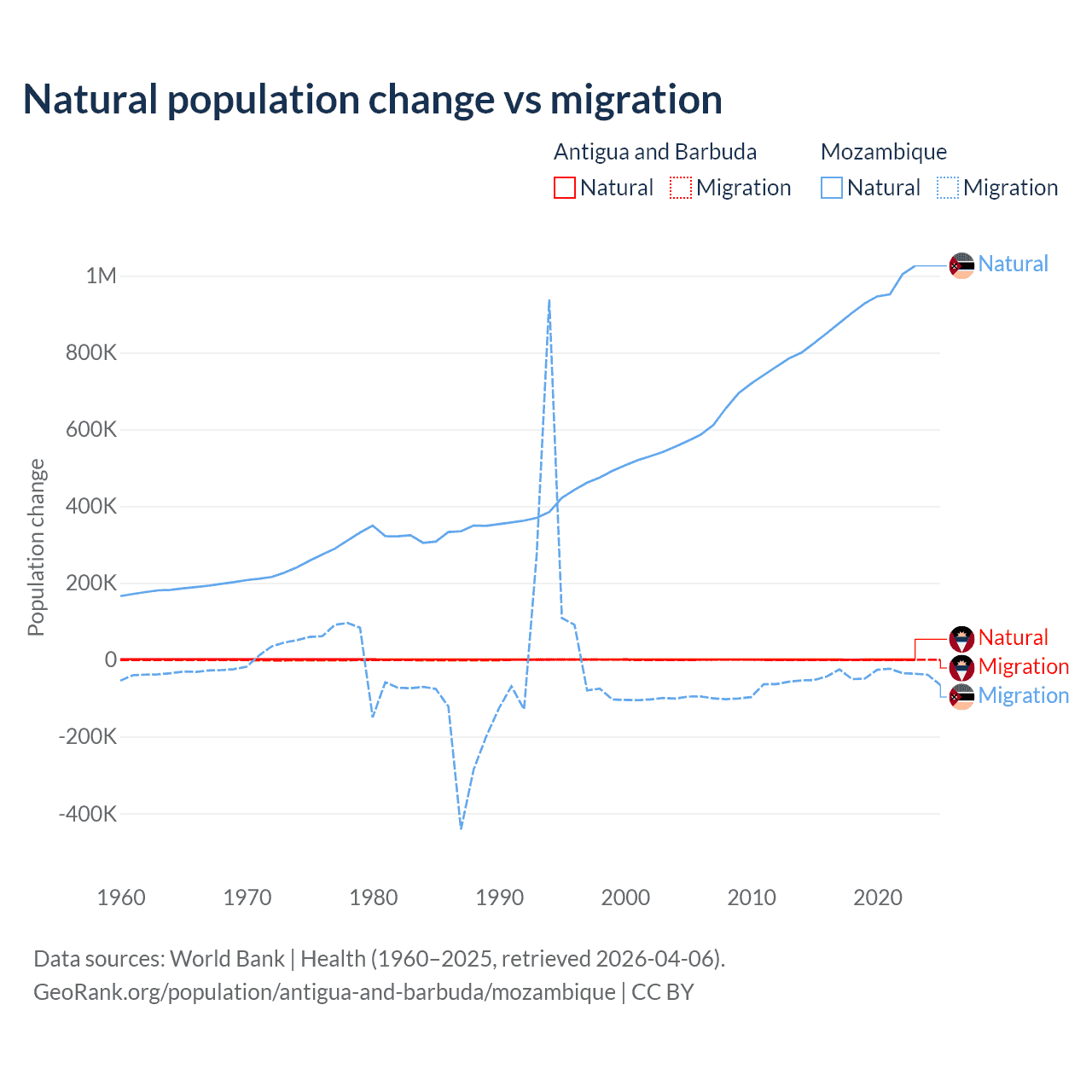 Over the last 10 years, 97.2% of the population change in Antigua and Barbuda is from natural causes (a gain of 4,971 people) and 2.76% is from migration (a gain of 141 people). In Mozambique 95.9% is from natural causes (a gain of 9,108,203 people) and 4.15% is from migration (a loss of 393,923 people).