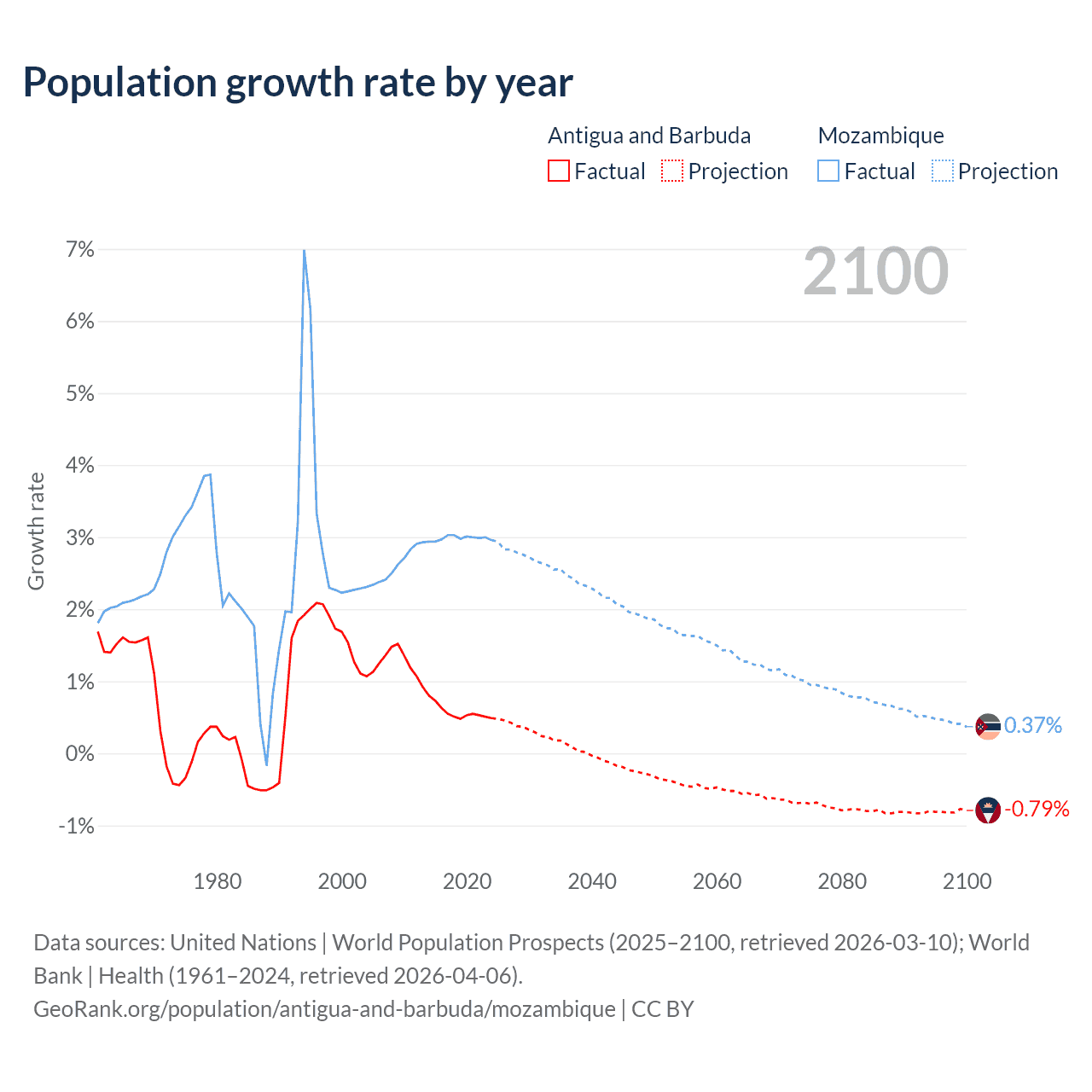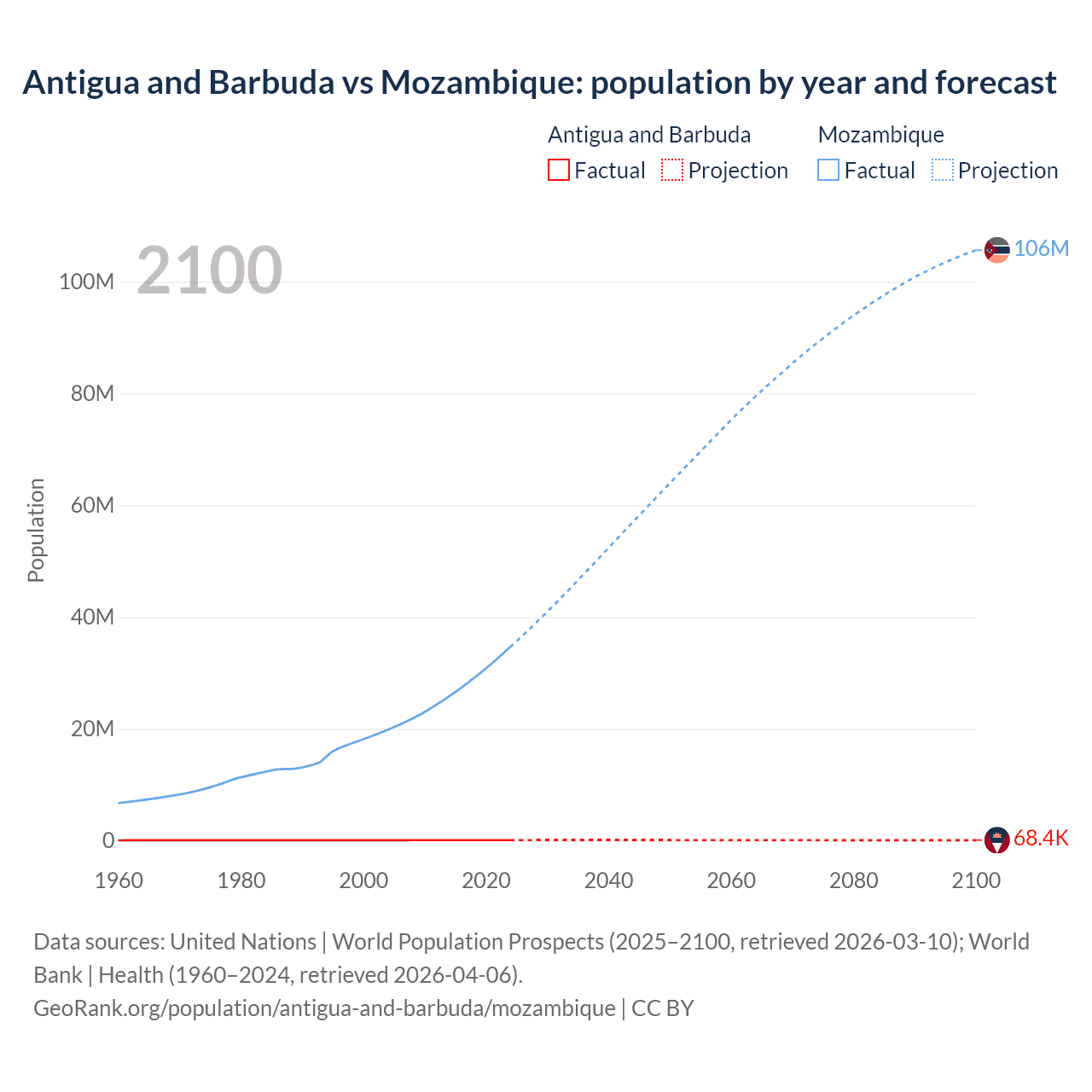 Antigua and Barbuda vs Mozambique: population by year and forecast