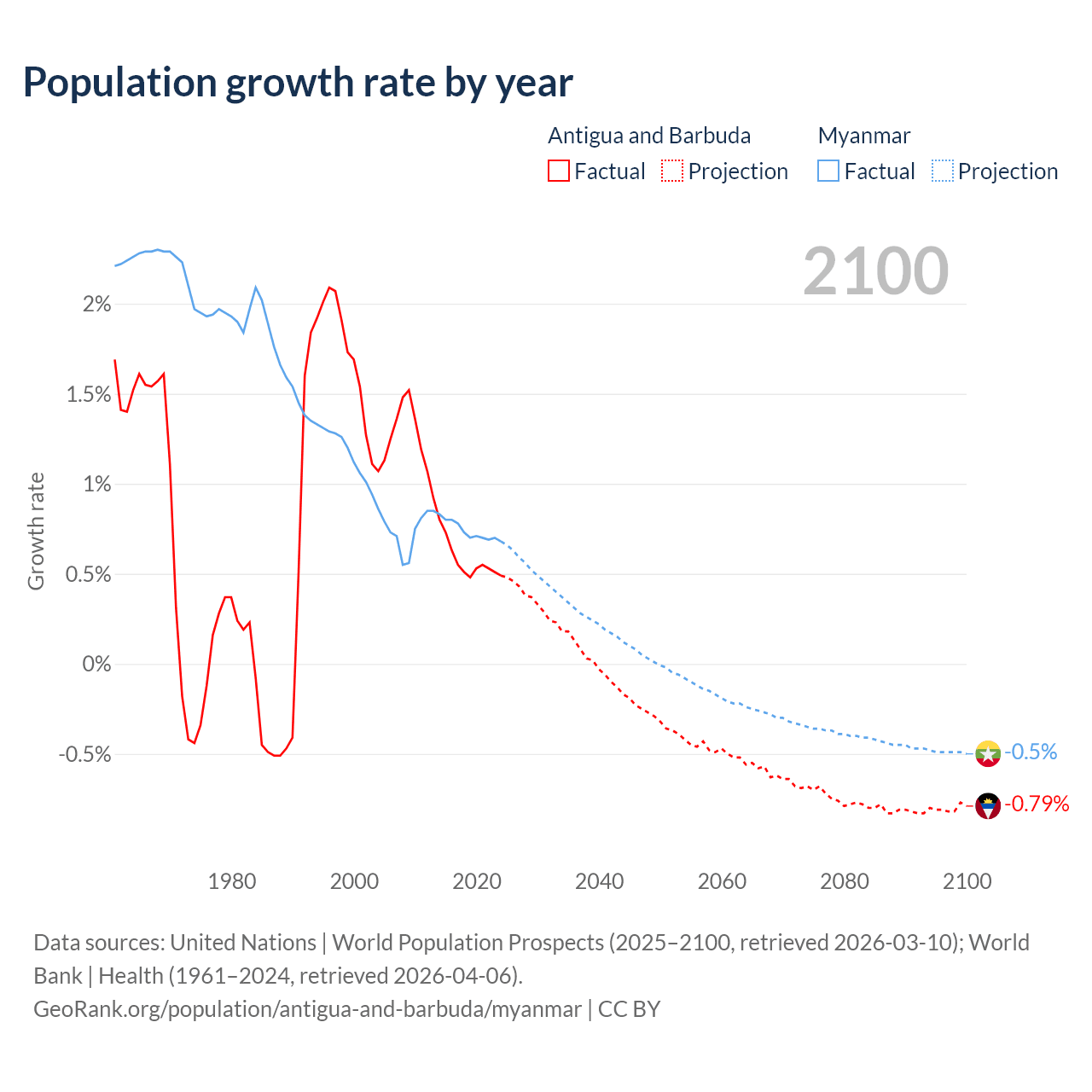 - For the last 10 years, Antigua and Barbuda has had an average growth rate of +0.57% per year vs +0.74% in Myanmar.