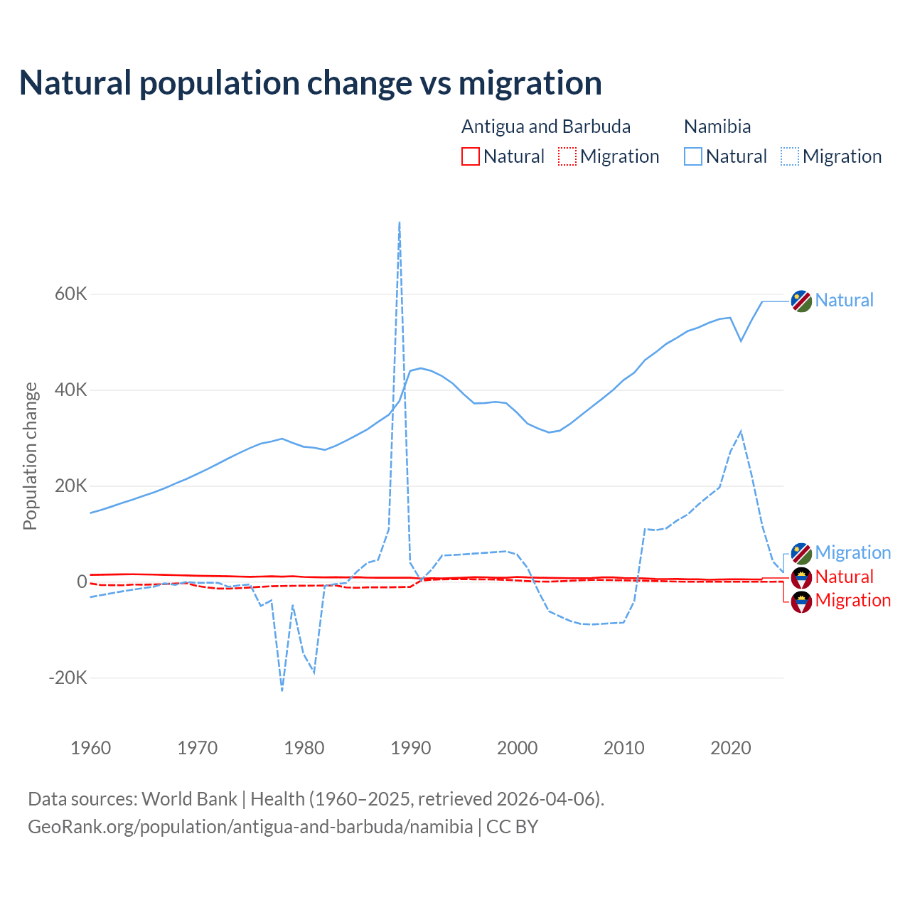 Over the last 10 years, 97.2% of the population change in Antigua and Barbuda is from natural causes (a gain of 4,971 people) and 2.76% is from migration (a gain of 141 people). In Namibia 74.3% is from natural causes (a gain of 532,532 people) and 25.7% is from migration (a gain of 183,837 people).