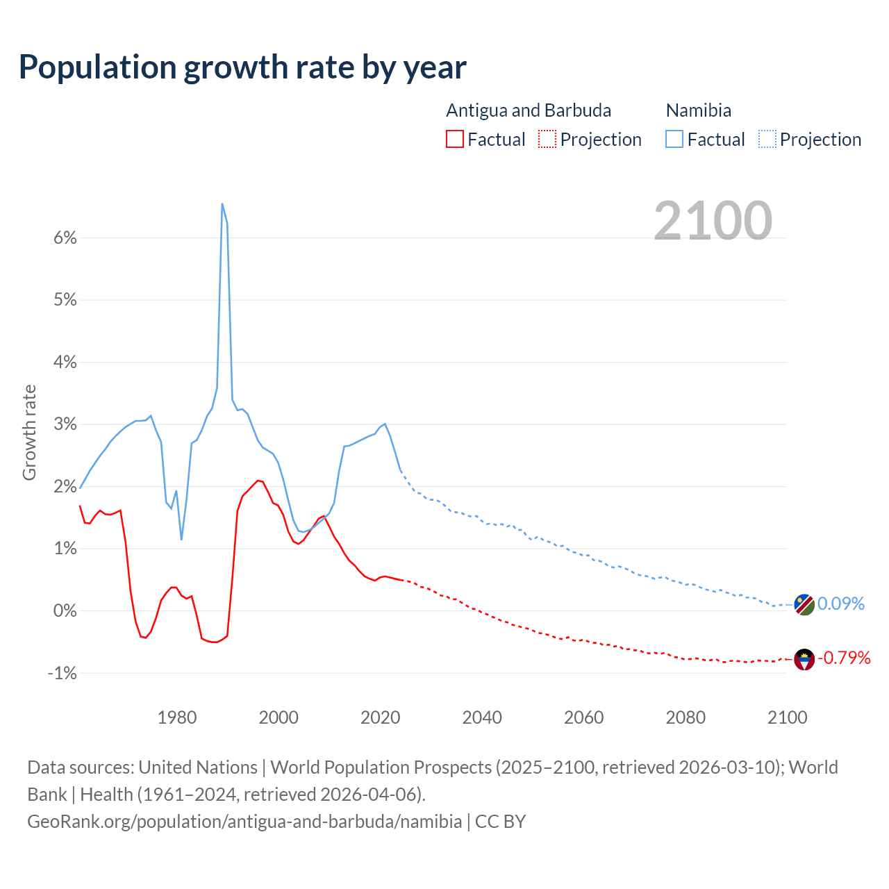 - For the last 10 years, Antigua and Barbuda has had an average growth rate of +0.57% per year vs +2.73% in Namibia.