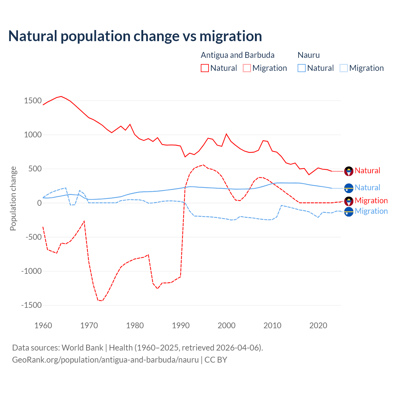 Over the last 10 years, 97.2% of the population change in Antigua and Barbuda is from natural causes (a gain of 4,971 people) and 2.76% is from migration (a gain of 141 people). In Nauru 66.2% is from natural causes (a gain of 2,590 people) and 33.8% is from migration (a loss of 1,320 people).