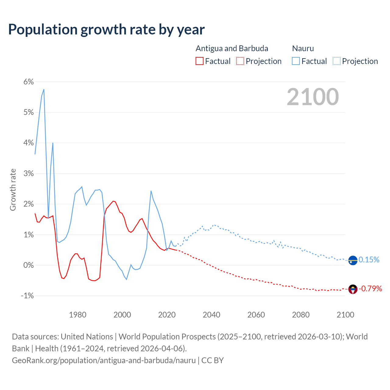 - For the last 10 years, Antigua and Barbuda has had an average growth rate of +0.57% per year vs +1.17% in Nauru.