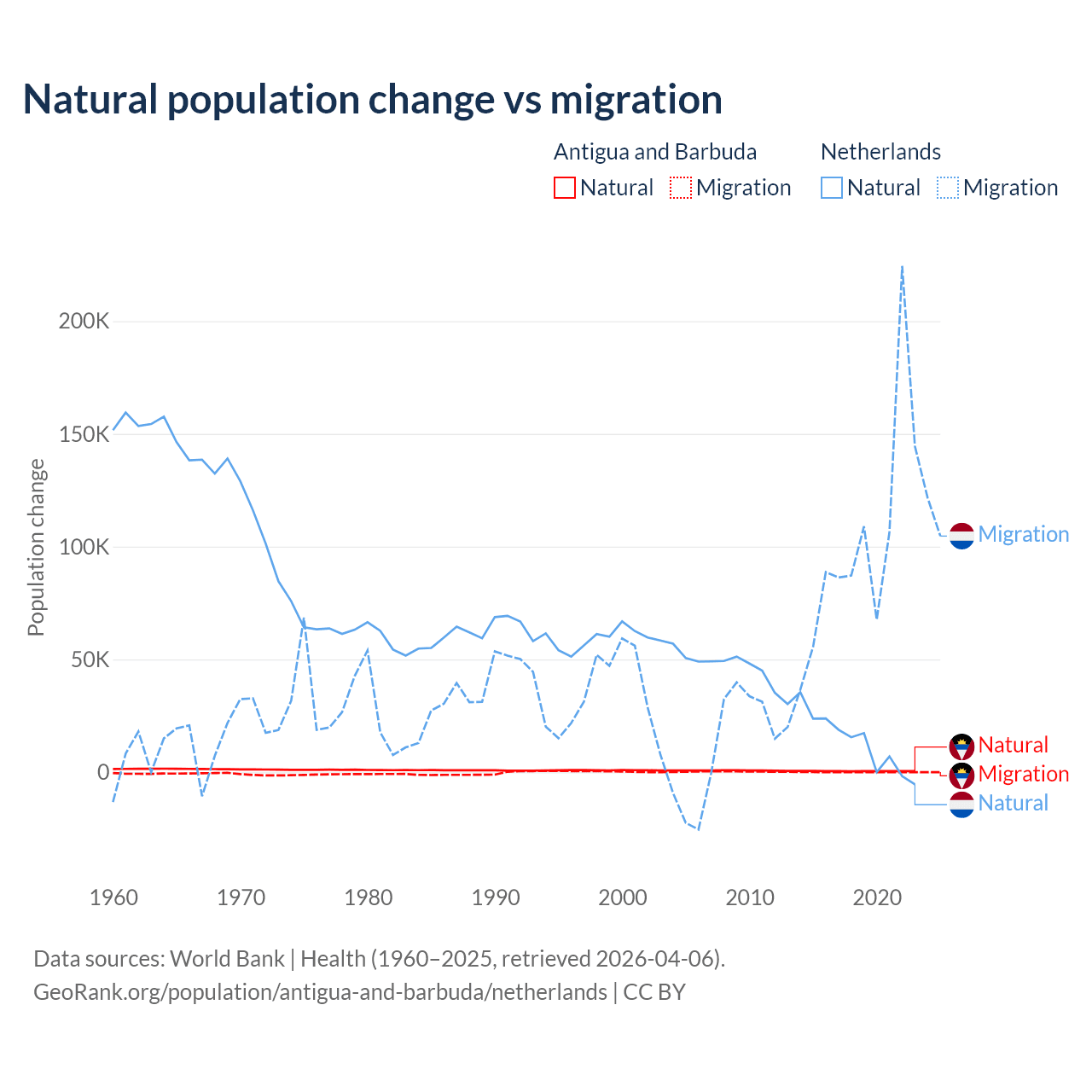 Over the last 10 years, 97.2% of the population change in Antigua and Barbuda is from natural causes (a gain of 4,971 people) and 2.76% is from migration (a gain of 141 people). In the Netherlands 11.8% is from natural causes (a gain of 134,554 people) and 88.2% is from migration (a gain of 1,006,495 people).
