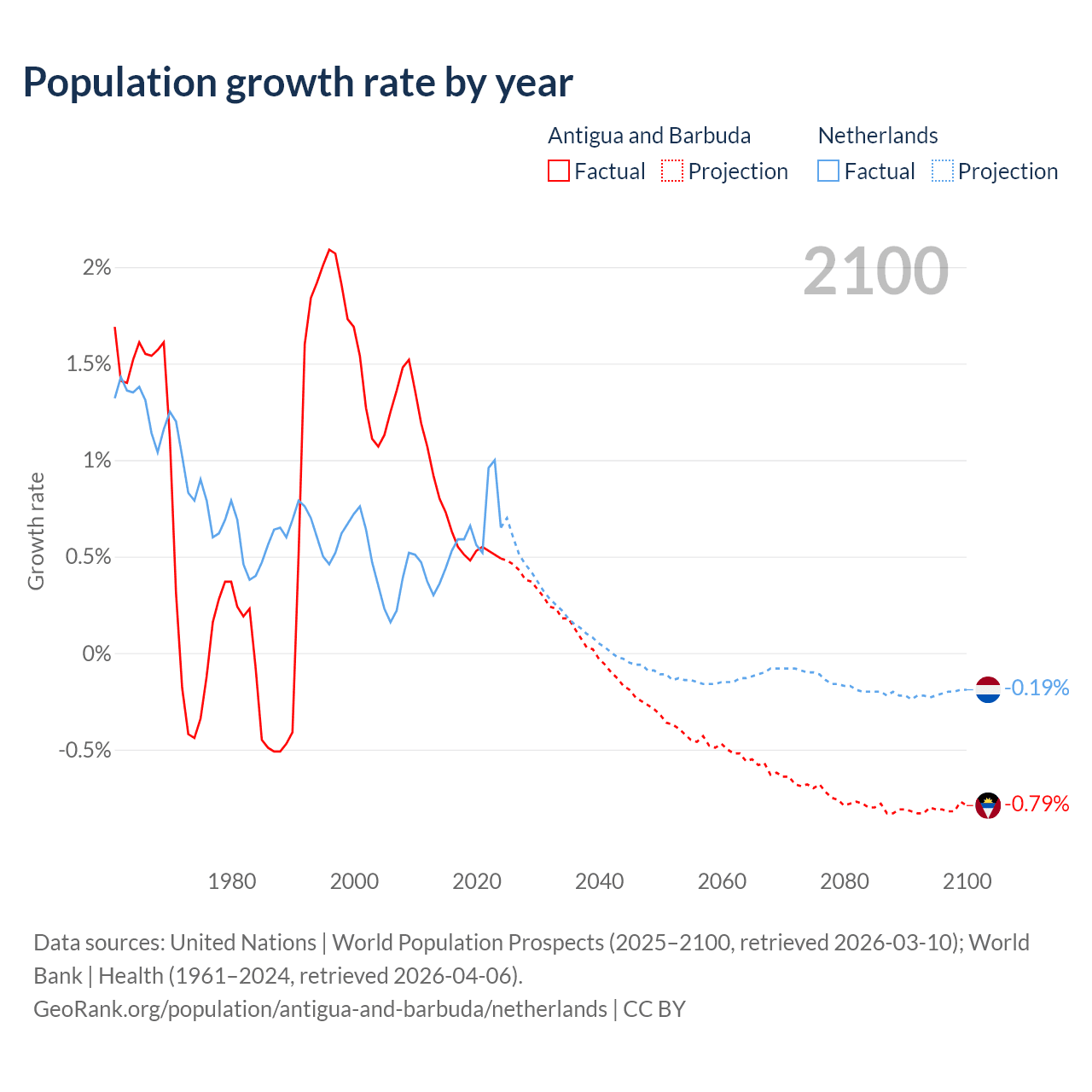 - For the last 10 years, Antigua and Barbuda has had an average growth rate of +0.57% per year vs +0.62% in the Netherlands.