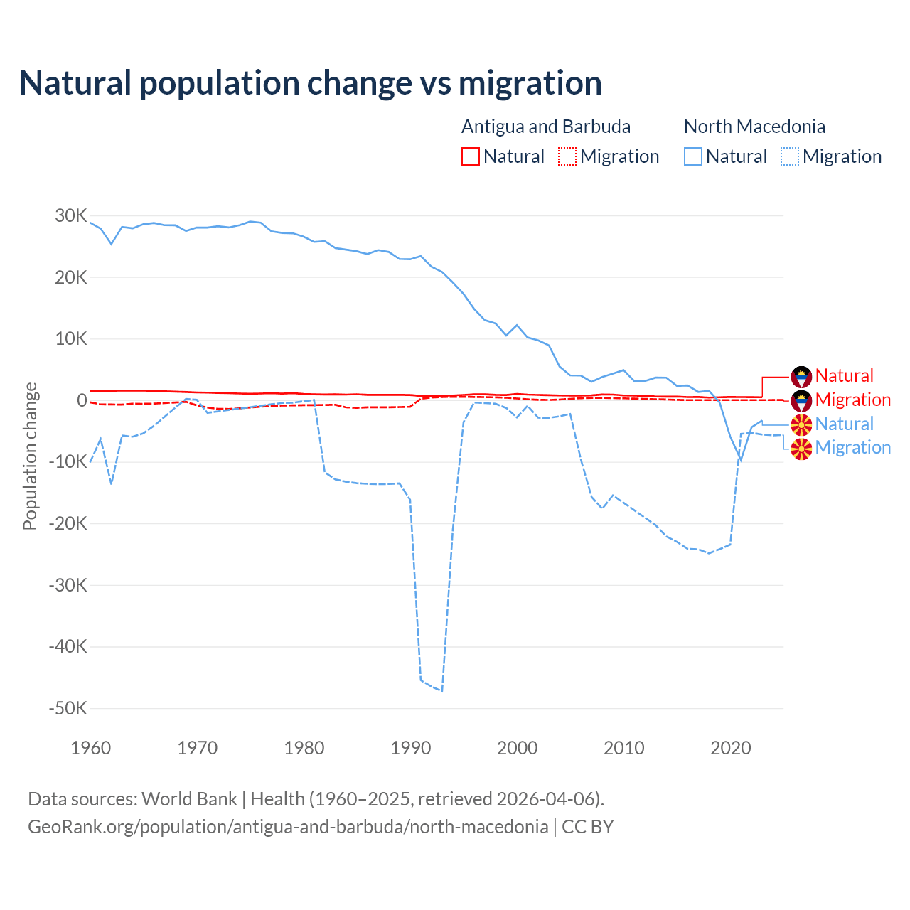 Over the last 10 years, 97.2% of the population change in Antigua and Barbuda is from natural causes (a gain of 4,971 people) and 2.76% is from migration (a gain of 141 people). In North Macedonia 6.45% is from natural causes (a loss of 12,585 people) and 93.5% is from migration (a loss of 182,429 people).