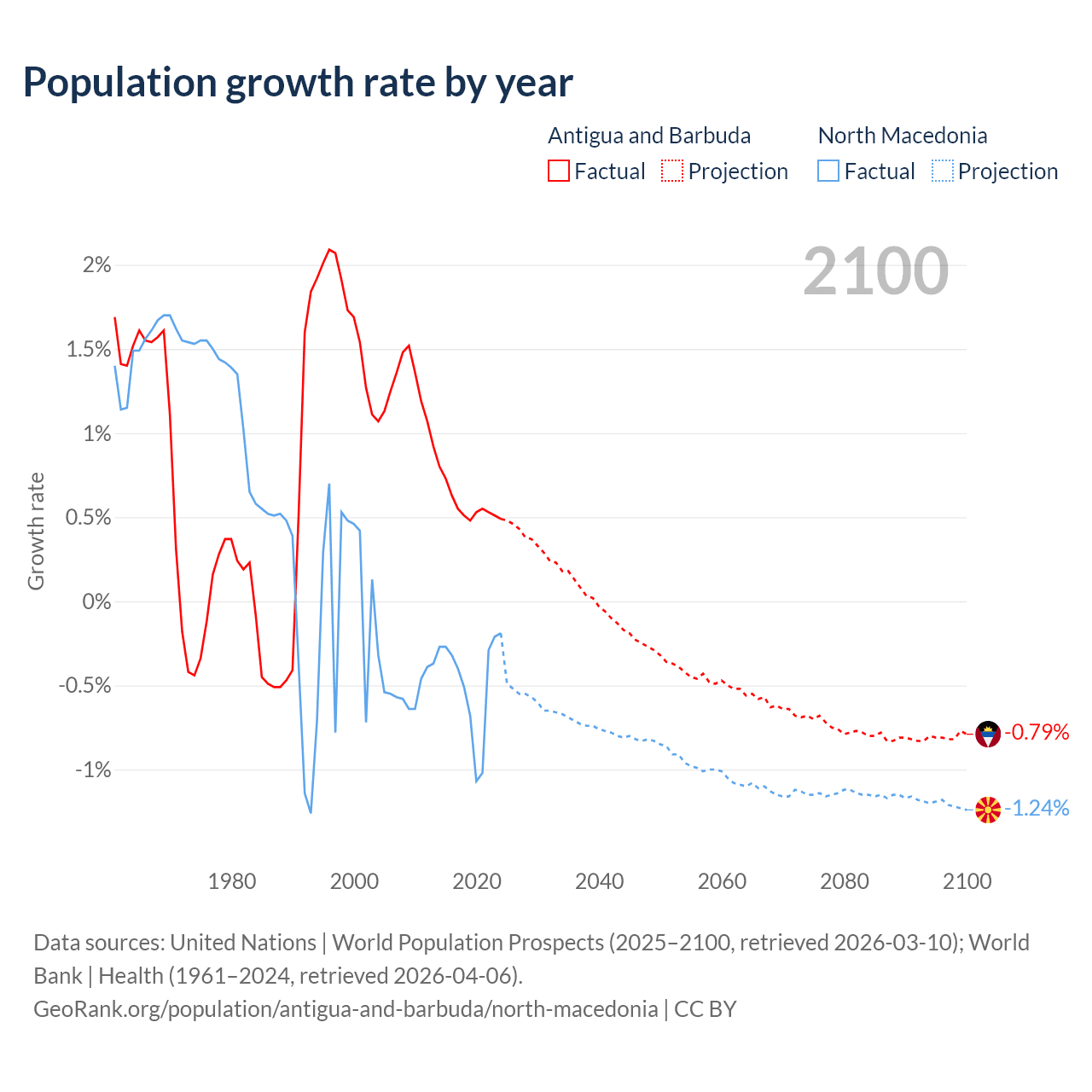 - For the last 10 years, Antigua and Barbuda has had an average growth rate of +0.57% per year vs -0.48% in North Macedonia.