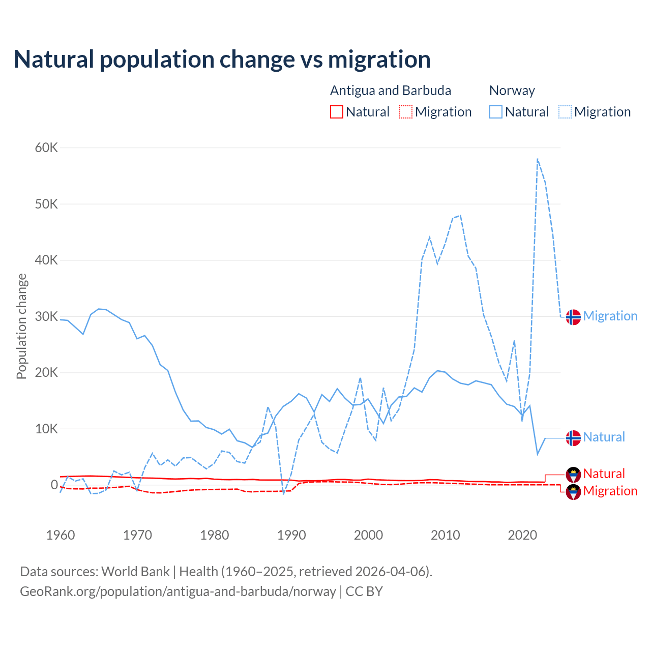 Over the last 10 years, 97.2% of the population change in Antigua and Barbuda is from natural causes (a gain of 4,971 people) and 2.76% is from migration (a gain of 141 people). In Norway 31.3% is from natural causes (a gain of 138,699 people) and 68.7% is from migration (a gain of 303,945 people).