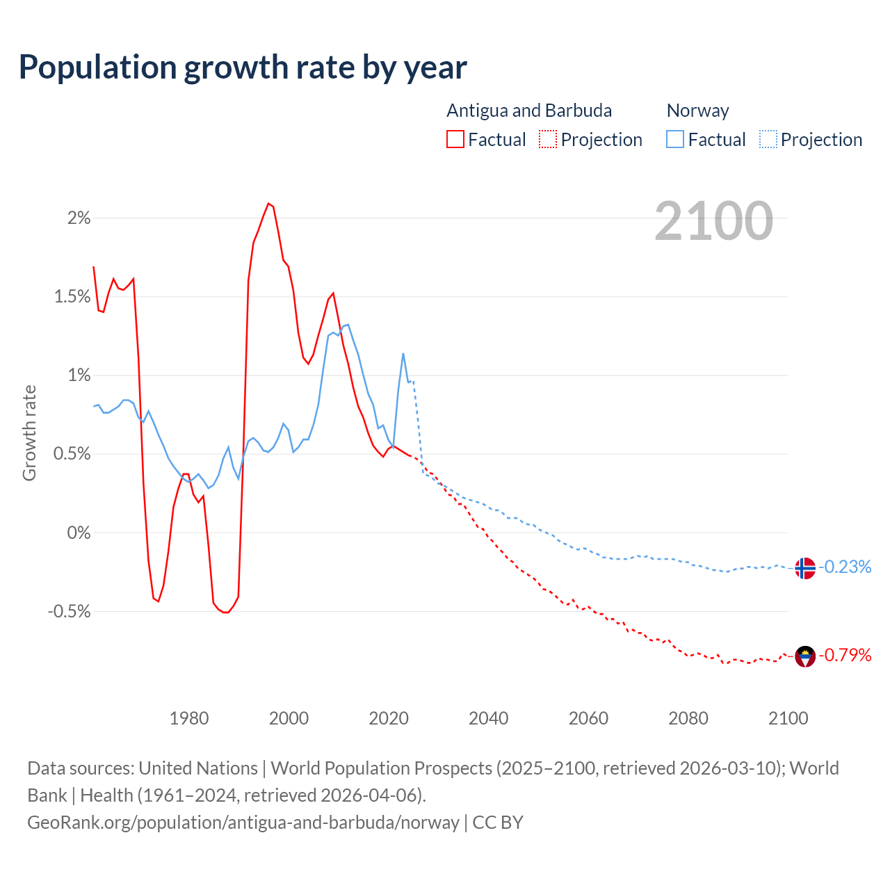 - For the last 10 years, Antigua and Barbuda has had an average growth rate of +0.57% per year vs +0.85% in Norway.