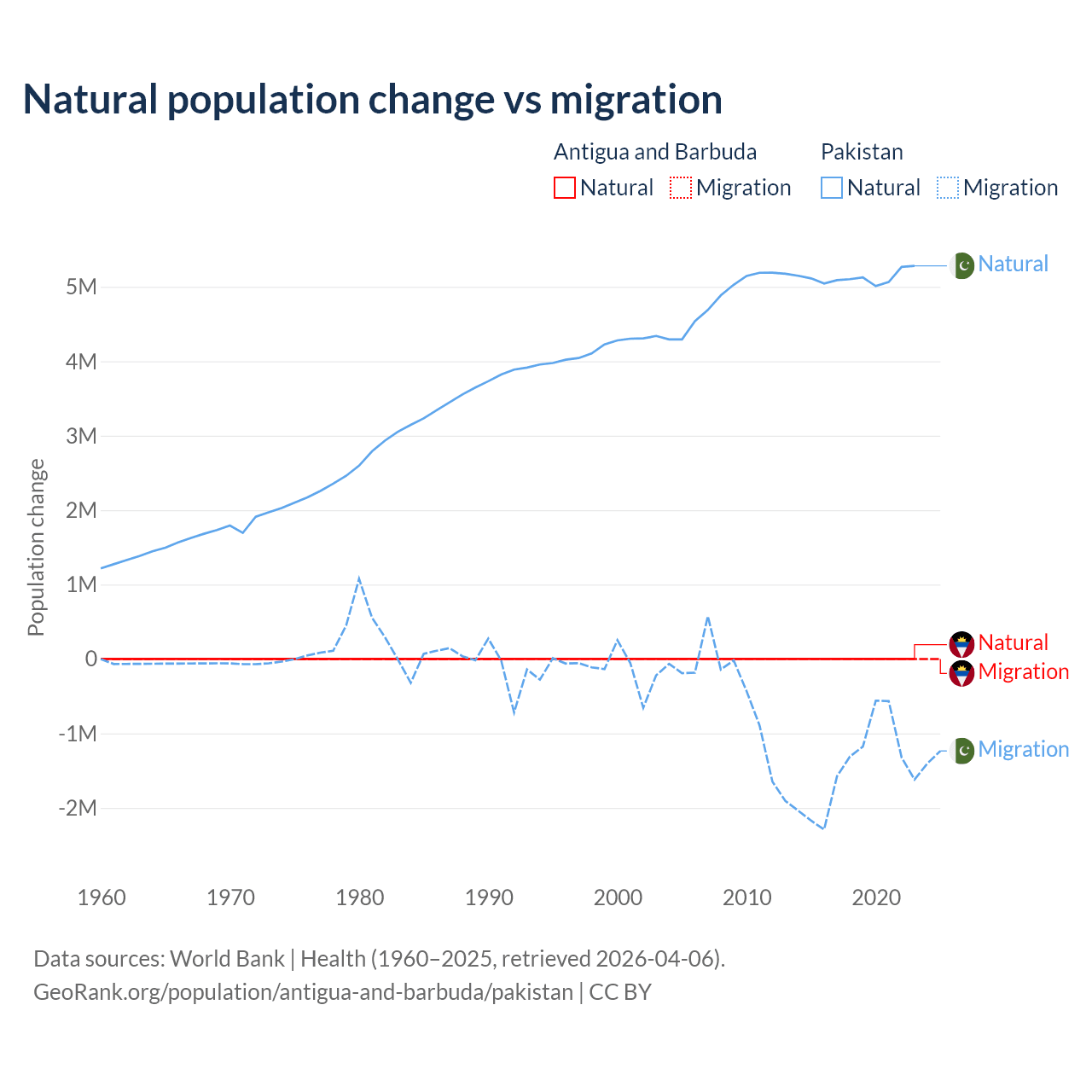 Over the last 10 years, 97.2% of the population change in Antigua and Barbuda is from natural causes (a gain of 4,971 people) and 2.76% is from migration (a gain of 141 people). In Pakistan 77.8% is from natural causes (a gain of 51,255,404 people) and 22.2% is from migration (a loss of 14,629,055 people).