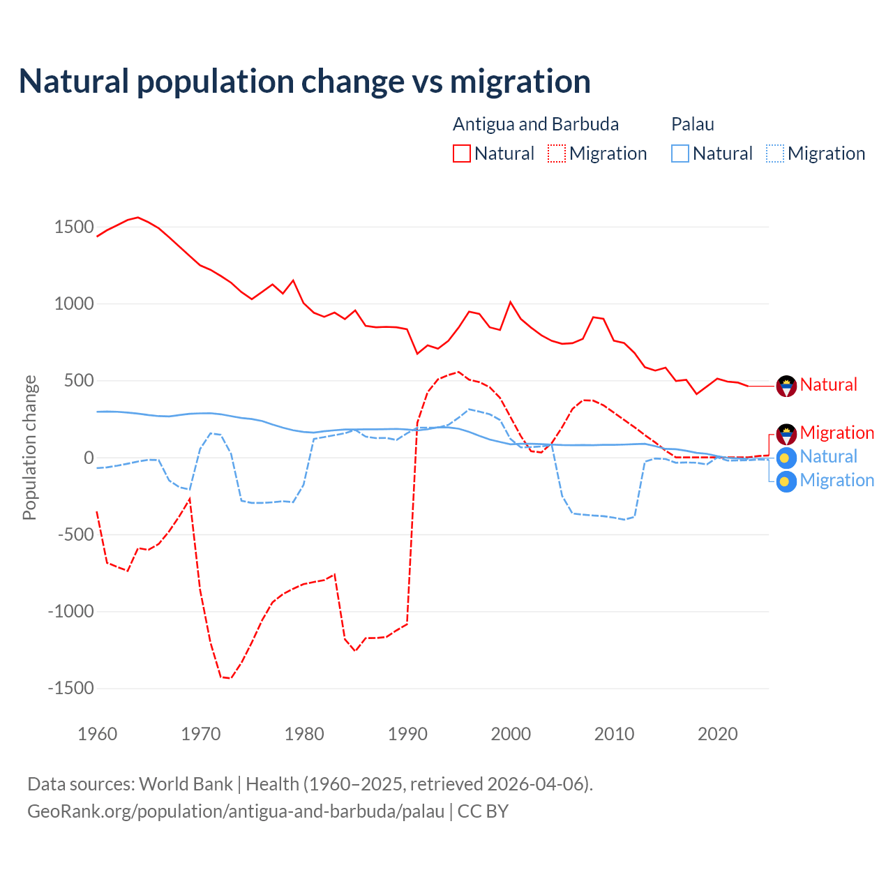 Over the last 10 years, 97.2% of the population change in Antigua and Barbuda is from natural causes (a gain of 4,971 people) and 2.76% is from migration (a gain of 141 people). In Palau 53.8% is from natural causes (a gain of 264 people) and 46.2% is from migration (a loss of 227 people).
