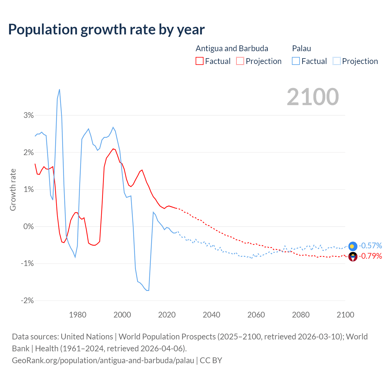 - For the last 10 years, Antigua and Barbuda has had an average growth rate of +0.57% per year vs +0.02% in Palau.