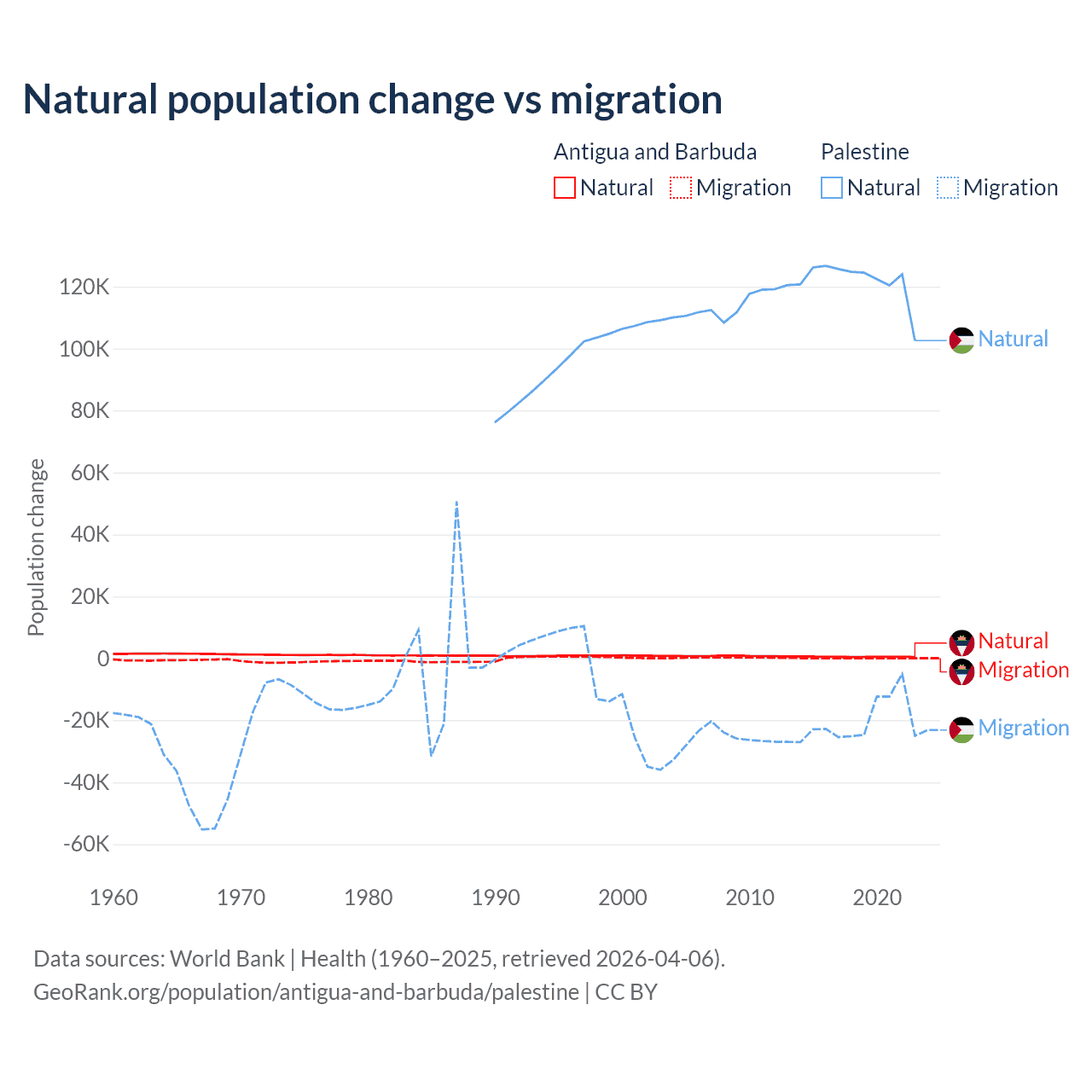 Over the last 10 years, 97.2% of the population change in Antigua and Barbuda is from natural causes (a gain of 4,971 people) and 2.76% is from migration (a gain of 141 people). In Palestine 85.7% is from natural causes (a gain of 1,218,010 people) and 14.3% is from migration (a loss of 202,820 people).