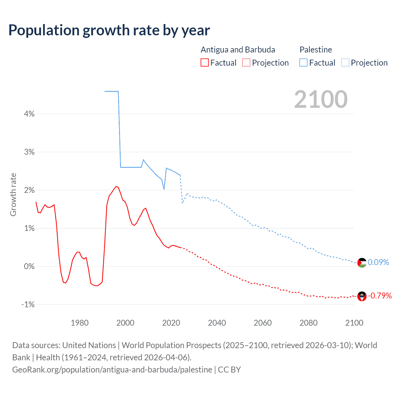 - For the last 10 years, Antigua and Barbuda has had an average growth rate of +0.57% per year vs +2.4% in Palestine.