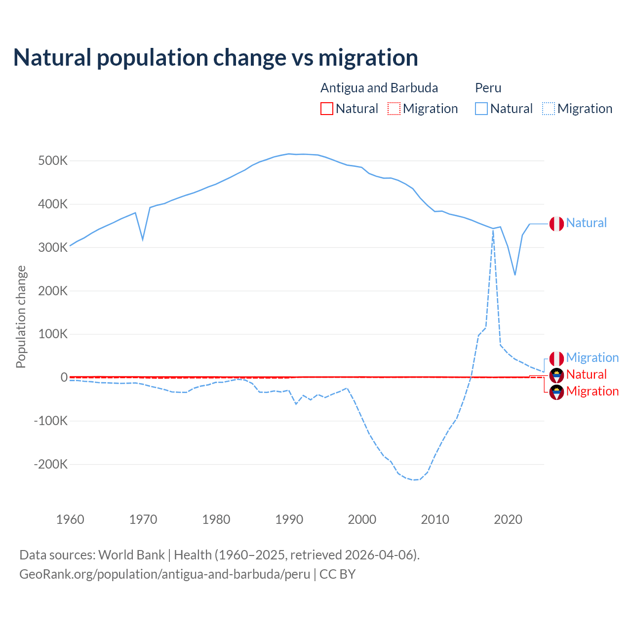 Over the last 10 years, 97.2% of the population change in Antigua and Barbuda is from natural causes (a gain of 4,971 people) and 2.76% is from migration (a gain of 141 people). In Peru 82% is from natural causes (a gain of 3,345,822 people) and 18% is from migration (a gain of 732,505 people).