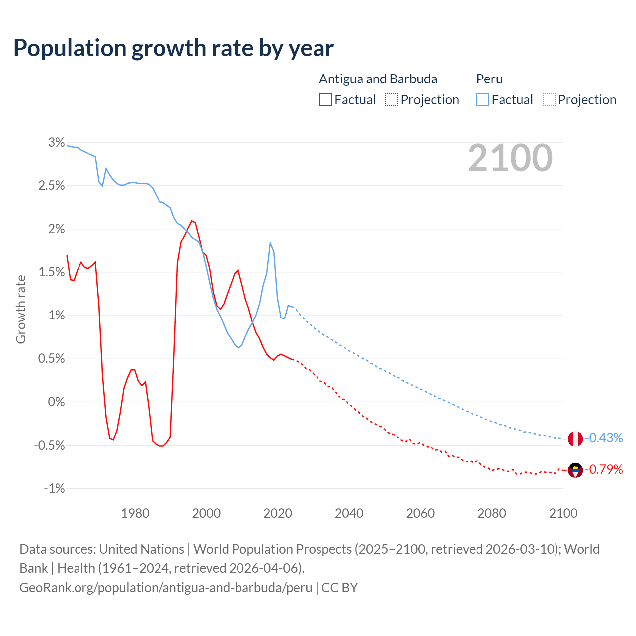 - For the last 10 years, Antigua and Barbuda has had an average growth rate of +0.57% per year vs +1.26% in Peru.