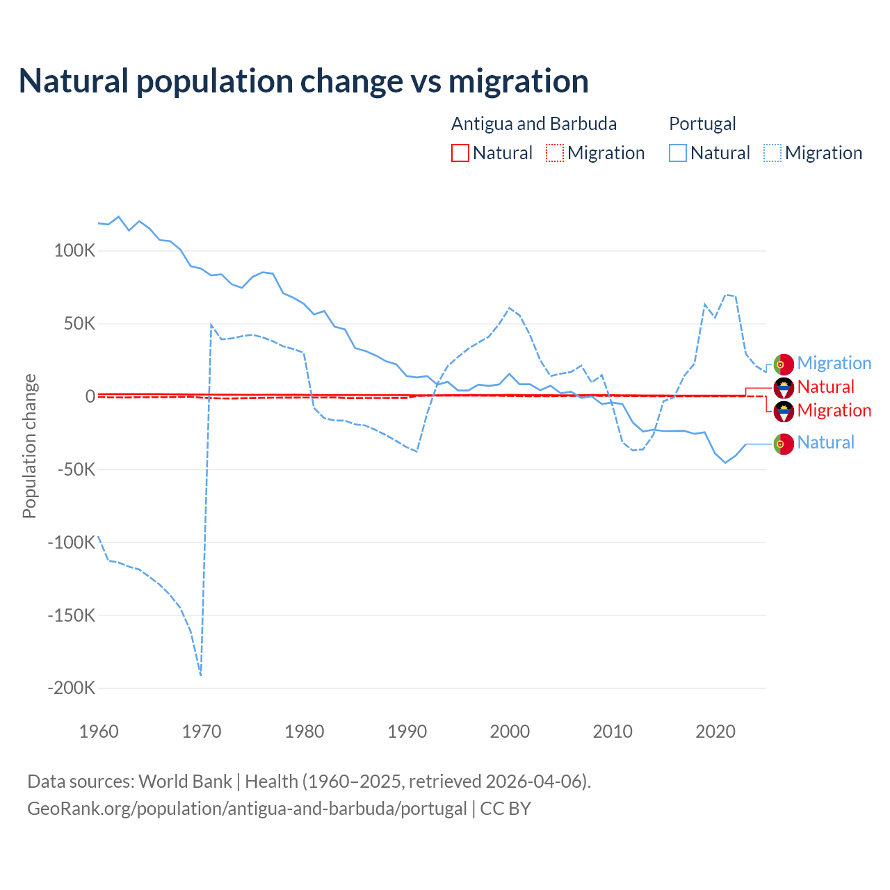 Over the last 10 years, 97.2% of the population change in Antigua and Barbuda is from natural causes (a gain of 4,971 people) and 2.76% is from migration (a gain of 141 people). In Portugal 51% is from natural causes (a loss of 302,748 people) and 49% is from migration (a gain of 290,554 people).