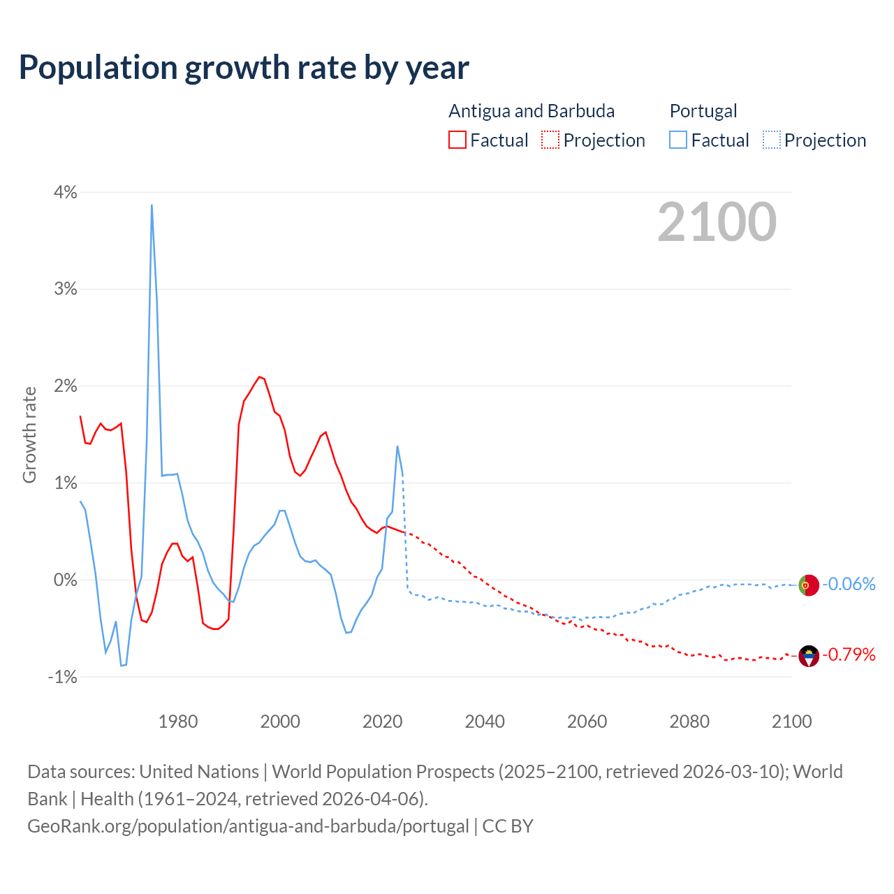 - For the last 10 years, Antigua and Barbuda has had an average growth rate of +0.57% per year vs +0.21% in Portugal.