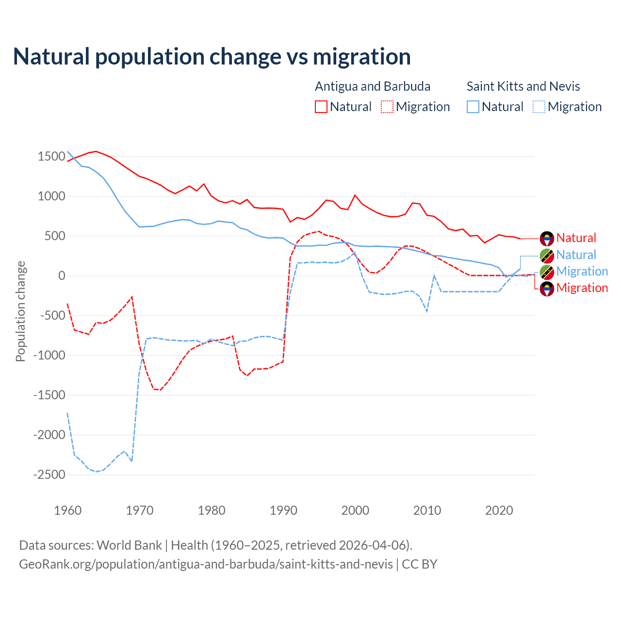 Over the last 10 years, 97.2% of the population change in Antigua and Barbuda is from natural causes (a gain of 4,971 people) and 2.76% is from migration (a gain of 141 people). In Saint Kitts and Nevis 44.9% is from natural causes (a gain of 1,225 people) and 55.1% is from migration (a loss of 1,506 people).