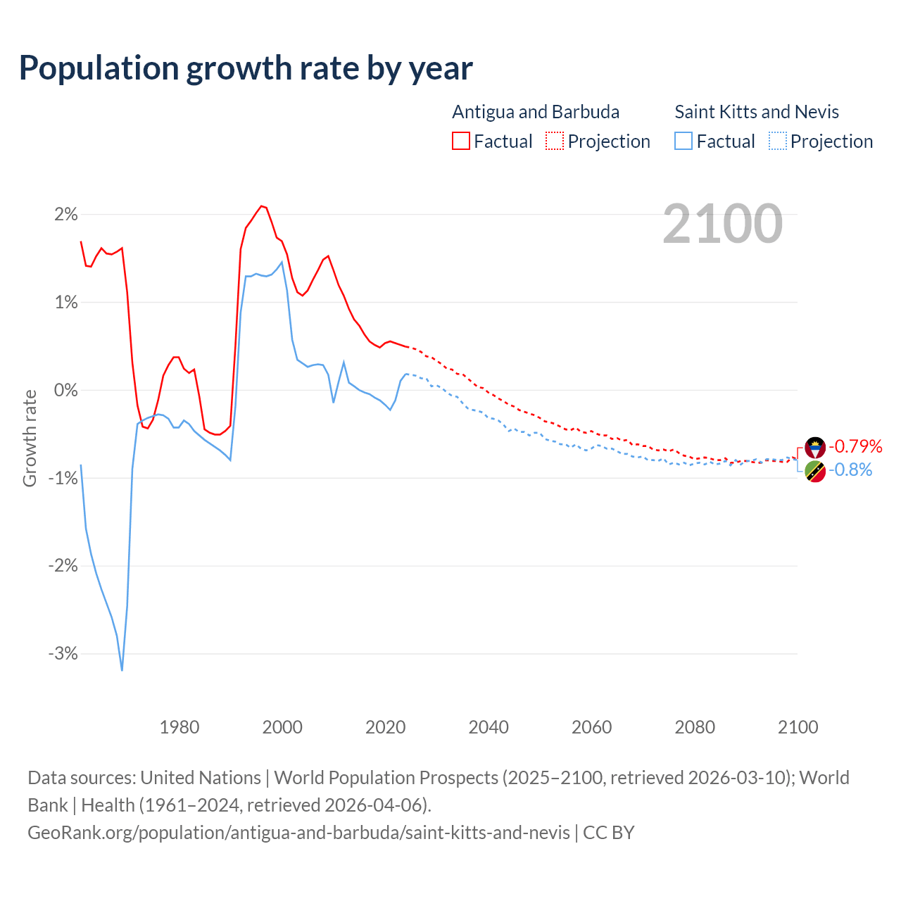 - For the last 10 years, Antigua and Barbuda has had an average growth rate of +0.57% per year vs -0.04% in Saint Kitts and Nevis.
