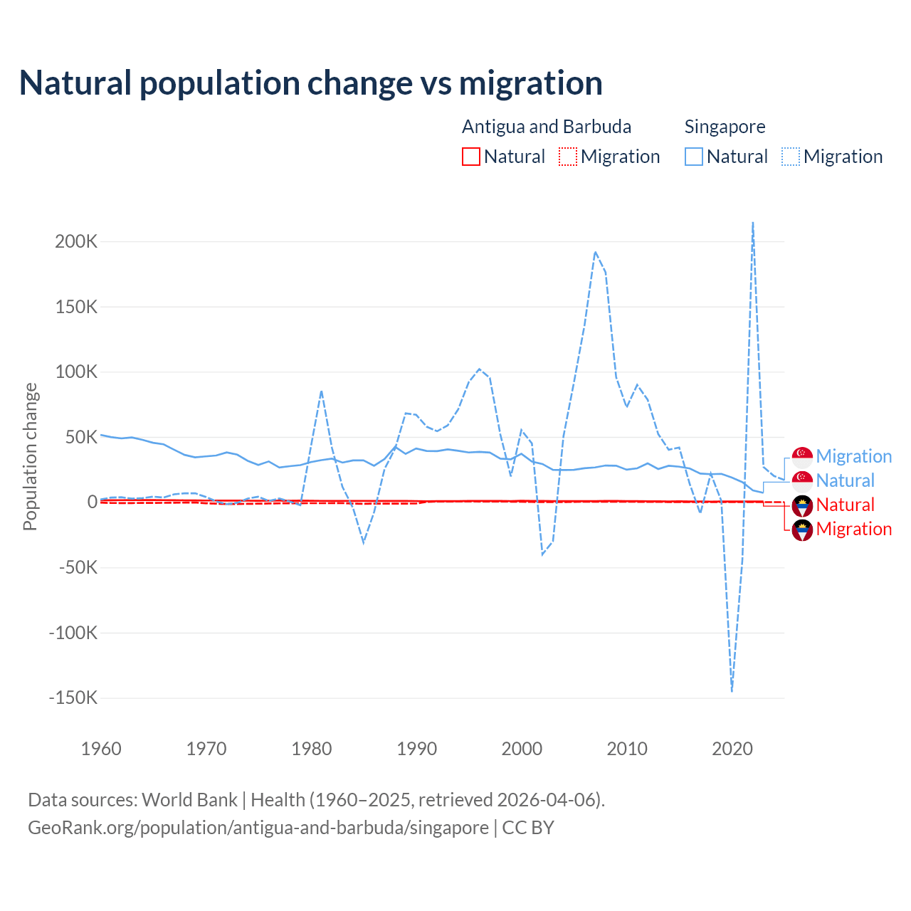 Over the last 10 years, 97.2% of the population change in Antigua and Barbuda is from natural causes (a gain of 4,971 people) and 2.76% is from migration (a gain of 141 people). In Singapore 54.8% is from natural causes (a gain of 195,953 people) and 45.2% is from migration (a gain of 161,805 people).