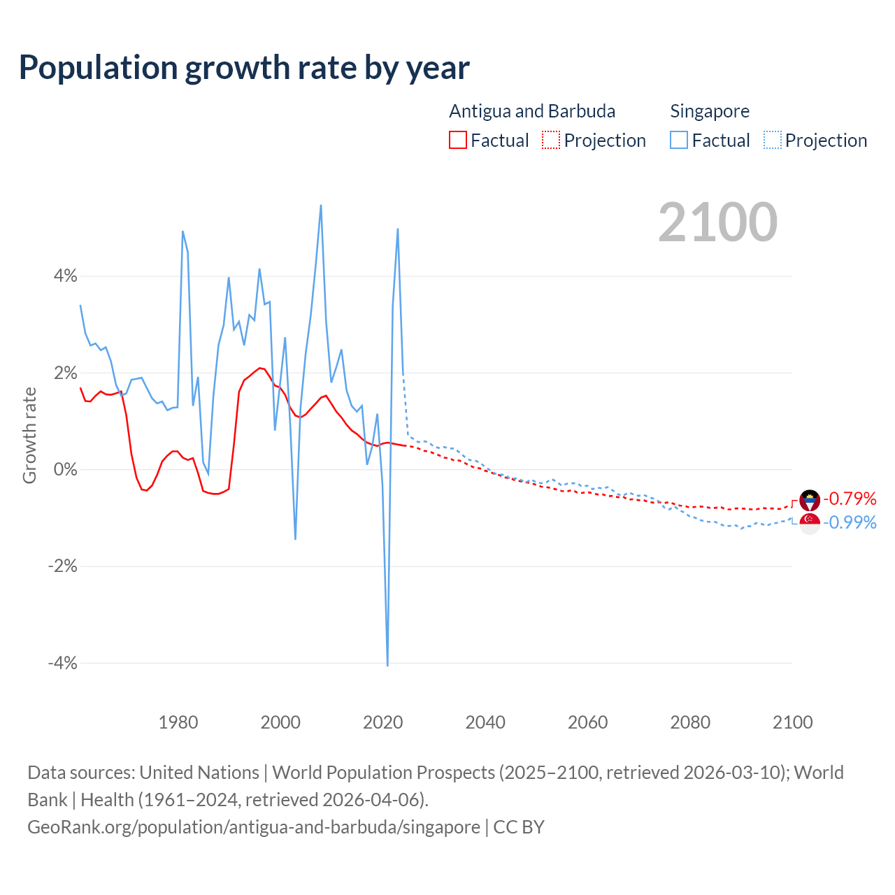 - For the last 10 years, Antigua and Barbuda has had an average growth rate of +0.57% per year vs +1.04% in Singapore.